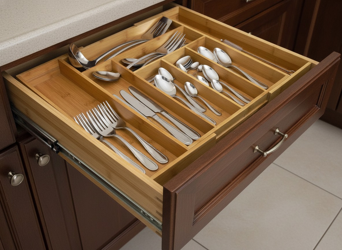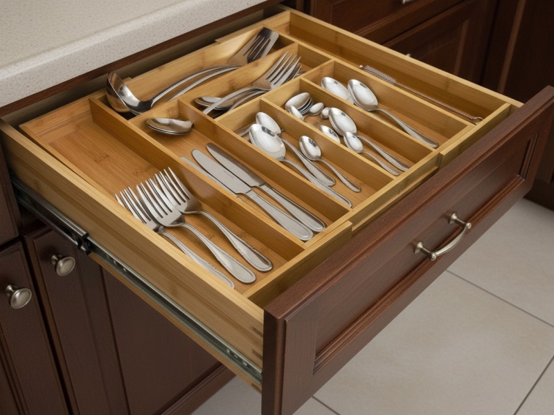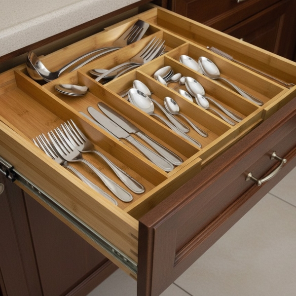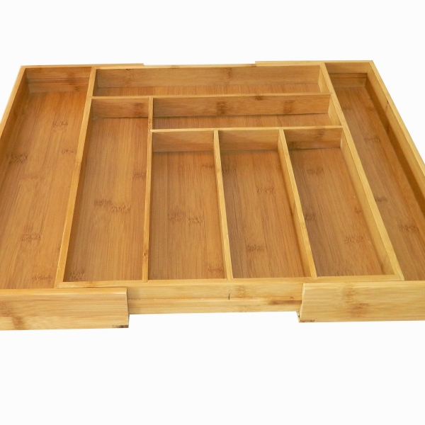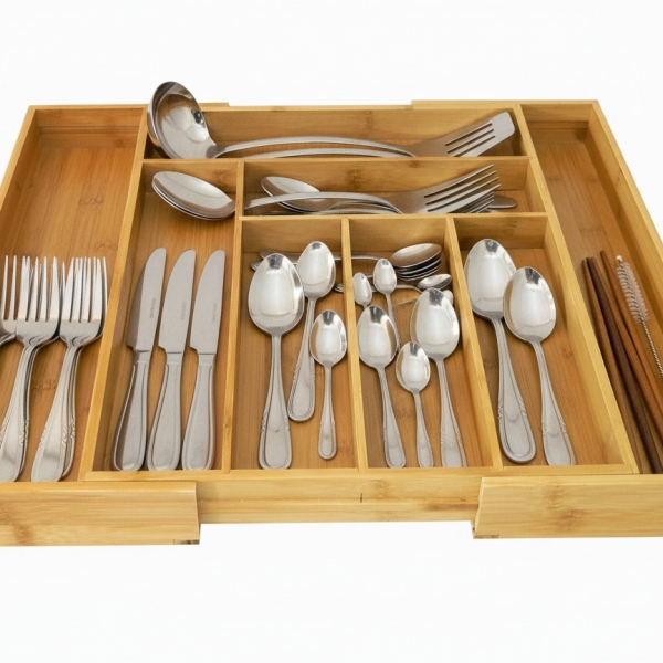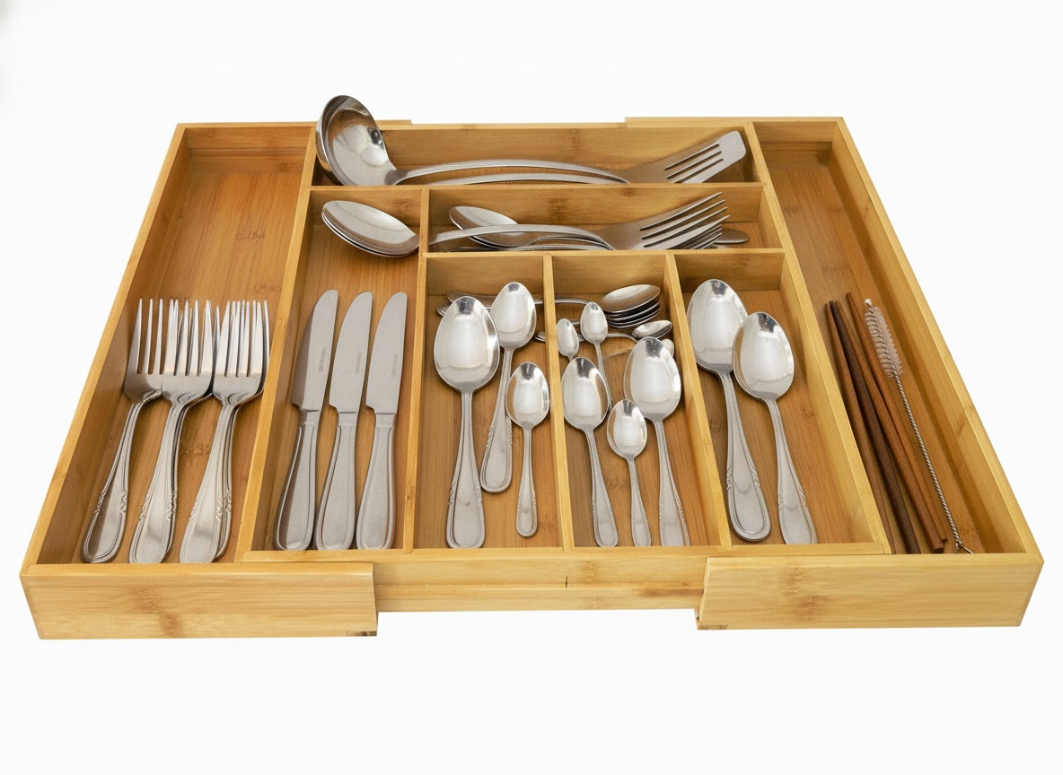 Discover efficient kitchen organization with this versatile expandable bamboo drawer organizer. Crafted from natural, eco-friendly bamboo, this durable utensil tray offers a sustainable solution for decluttering your kitchen drawers. Its intelligent design features multiple compartments, perfect for neatly storing silverware, cooking tools, and various kitchen gadgets. The innovative expandable sides slide out smoothly, allowing the organizer to adjust and fit a wide range of drawer widths, ensuring a custom fit for almost any kitchen layout in homes across the USA and Europe. Enhance your culinary space with this stylish and functional bamboo cutlery holder, promoting a tidy and accessible environment for all your essentials.