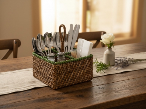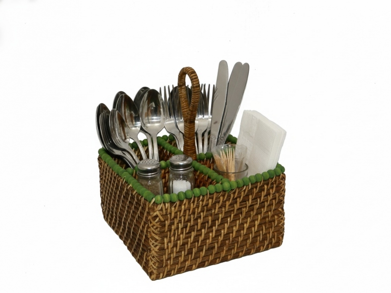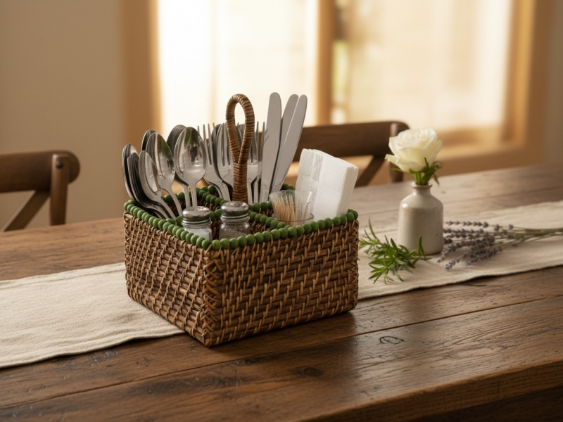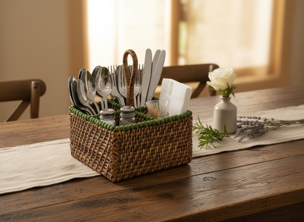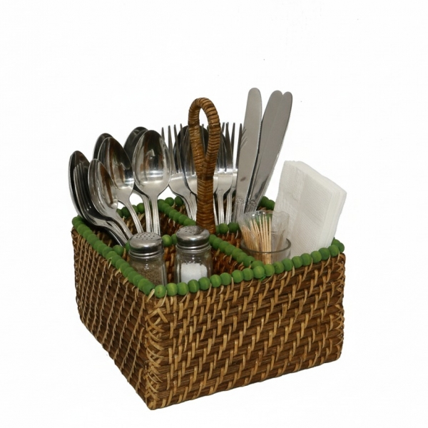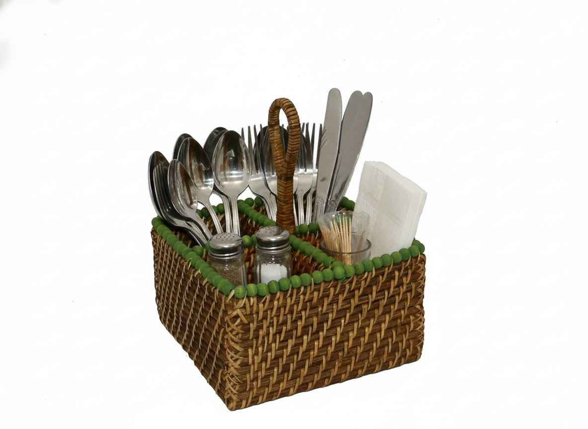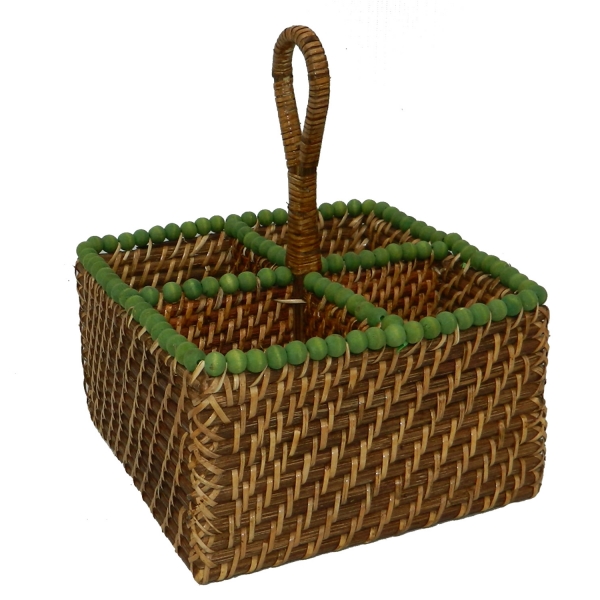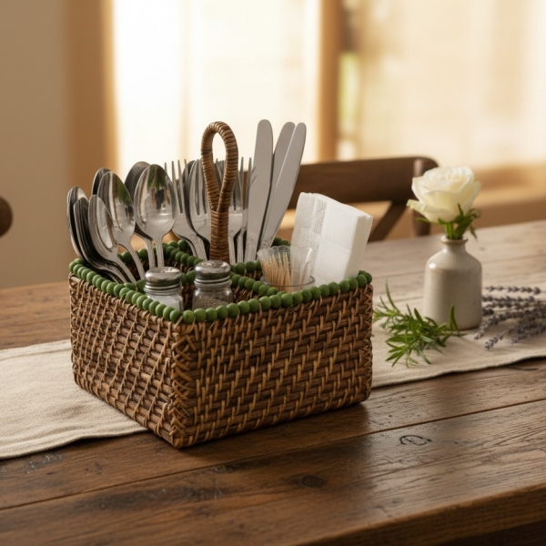 Discover this charming rattan flatware caddy, a stylish and practical addition to any kitchen or dining space. Handwoven from durable natural rattan, this caddy features four distinct compartments, perfect for organizing forks, knives, spoons, and napkins. A sturdy central handle allows for easy portability, making it ideal for indoor dining, outdoor picnics, or buffet setups. The design is enhanced by a decorative trim of vibrant green wooden beads along the top edge, adding a touch of rustic elegance and a pop of color. Its versatile appeal complements various decor styles, from modern farmhouse to bohemian chic. This eco-friendly organizer is not just functional but also a beautiful centerpiece for entertaining guests or simply keeping your daily essentials neatly stored. Elevate your dining experience with this beautifully crafted utensil holder.