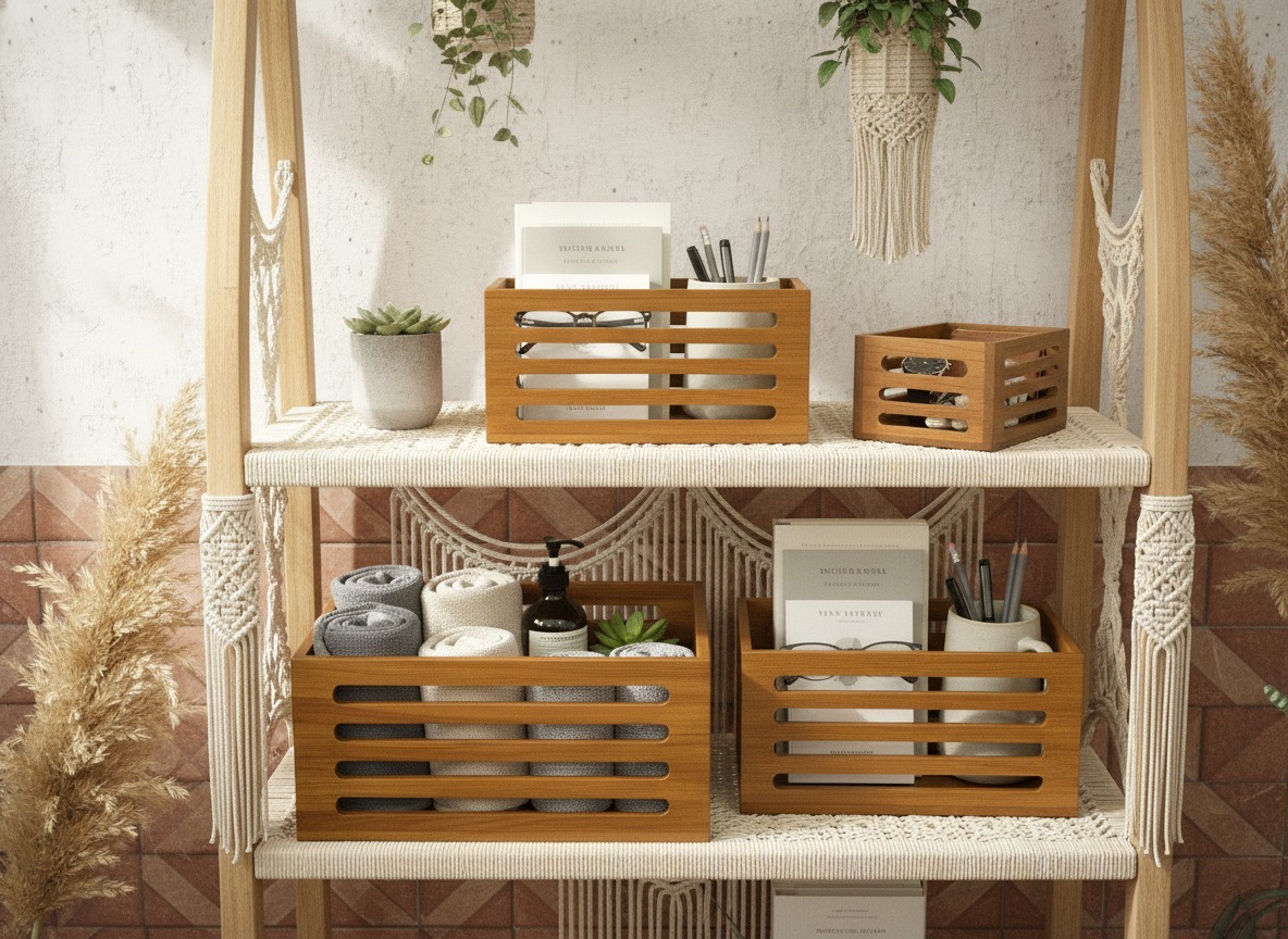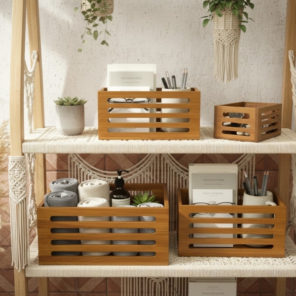 Uncover this innovation with a versatile set of three acacia wood open storage bins, designed to bring both style and organization to any home or office space. These beautifully crafted wooden crates feature a warm, natural finish and a modern slatted design, offering a chic solution for decluttering. Ranging in size, they can be nested or used individually, providing flexible storage for a variety of items. Ideal for enhancing interior aesthetics while maintaining tidiness, these eco-friendly acacia bins blend seamlessly with contemporary, minimalist, or rustic decor themes. Perfect for conscious consumers seeking sustainable and elegant home organization tools in USA and European markets.