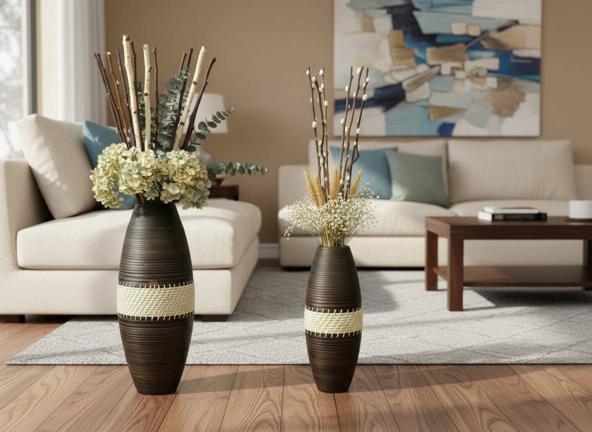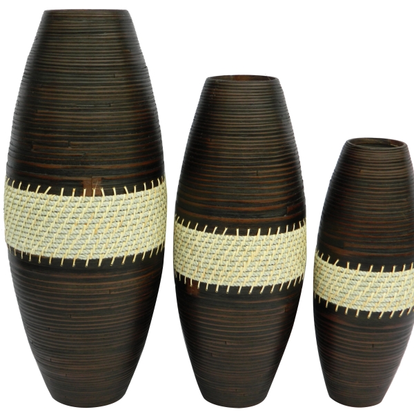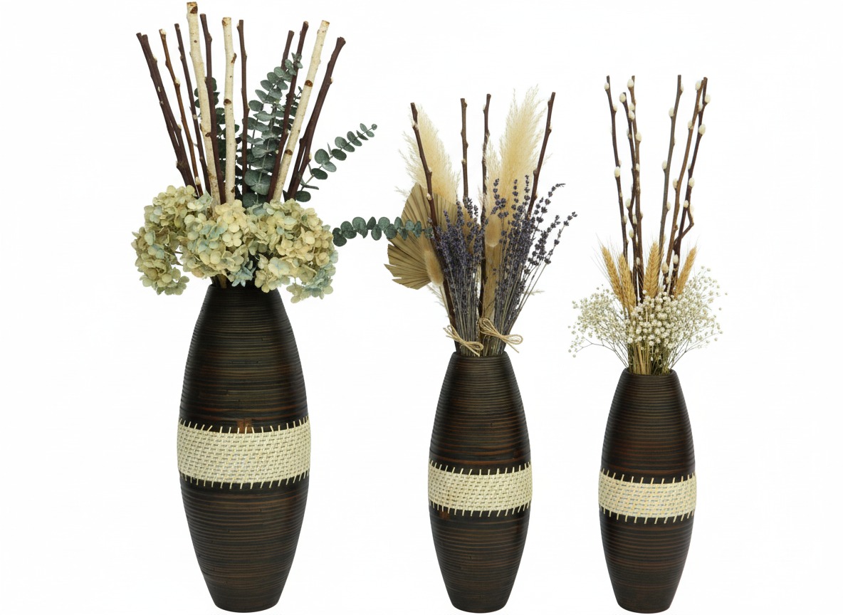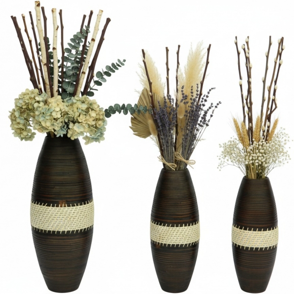 This elegant set of three decorative bamboo vases offers a sophisticated touch to any modern or rustic interior. Each vase, varying in height, is meticulously crafted from dark-stained bamboo, showcasing a unique ridged texture that adds depth and visual interest. A striking central band of light, intricately woven rattan or natural fiber beautifully contrasts with the darker body, enhancing their contemporary appeal. Perfect for adding organic charm, these versatile vases can serve as standalone statement pieces or hold dried botanicals, complementing a wide range of decor styles from minimalist to bohemian. Elevate your home or office space with these eco-friendly and stylish decorative accents.