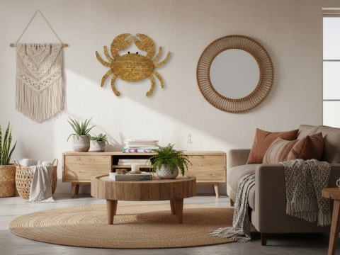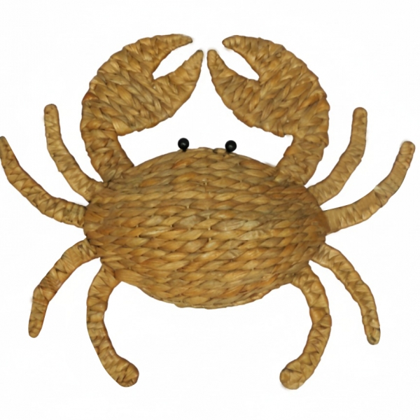 This charming, handcrafted wall decor features a delightful crab design, meticulously woven from natural plant fibers, likely water hyacinth or similar wicker material. Its rustic, earthy tones and intricate texture add a touch of coastal elegance and beachy charm to any interior. With prominent claws, legs, and distinct black eyes, this unique piece captures the essence of marine life in an artistic form. Ideal for enhancing living rooms, bathrooms, or seaside-themed bedrooms, this SEO-friendly decor item is perfect for those looking to infuse their space with a relaxed, natural aesthetic and a subtle nod to oceanic beauty. It serves as an eye-catching accent, celebrating artisanal craftsmanship and sustainable materials.