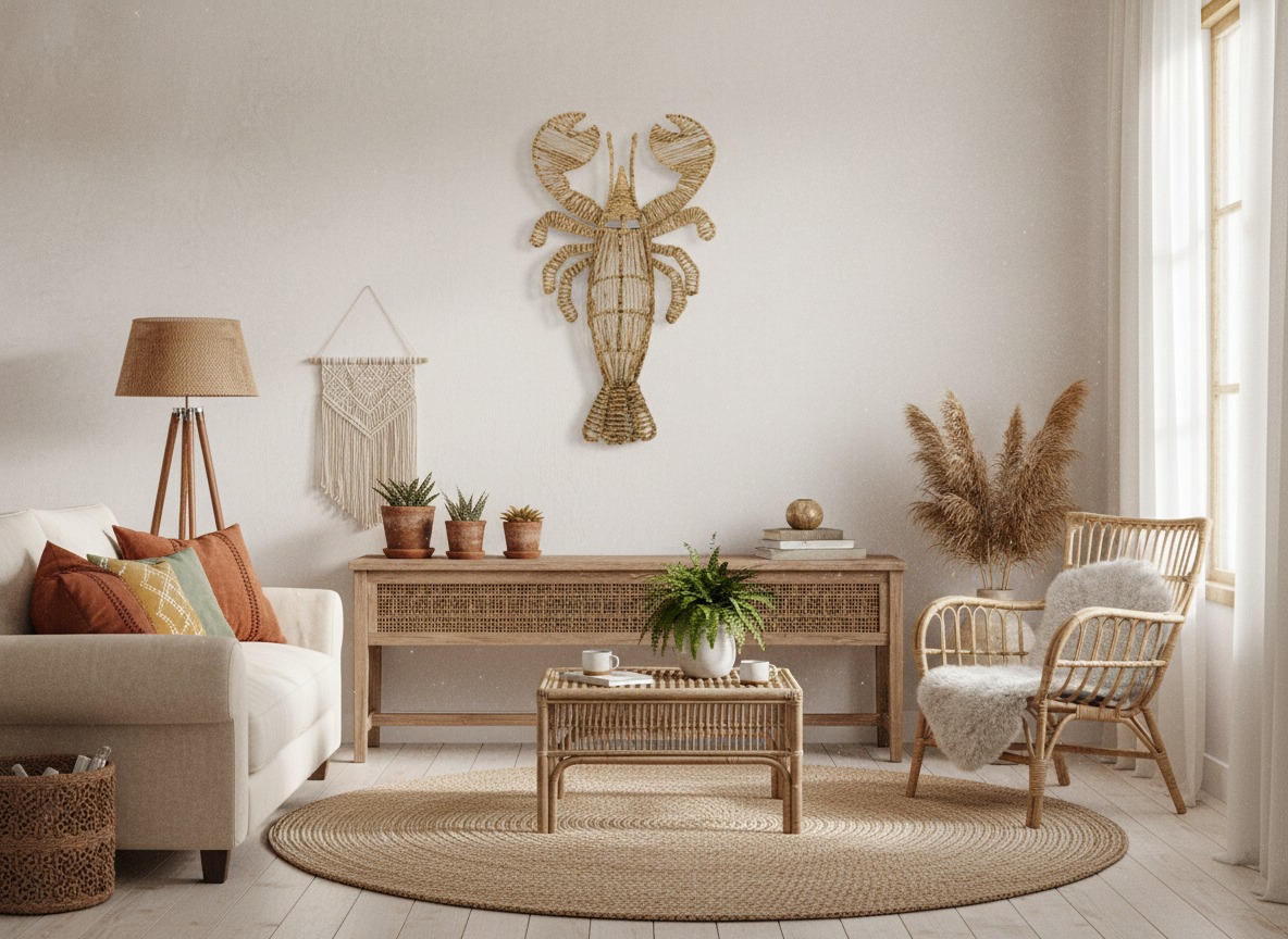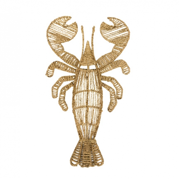 Introducing our captivating lobster-shaped wall decor, a perfect blend of rustic charm and coastal elegance. Expertly crafted from natural woven fibers like seagrass, its intricate design beautifully captures the distinct features of a lobster, including its prominent claws and segmented body. This unique piece offers a touch of the seaside to any interior, making it an ideal accent for coastal-themed homes, bohemian spaces, or even a nautical-inspired restaurant. Its natural texture and warm earthy tones enhance existing decor, providing an engaging focal point. A stylish way to bring oceanic flair and artisanal craftsmanship into your living room, dining area, or beach house.