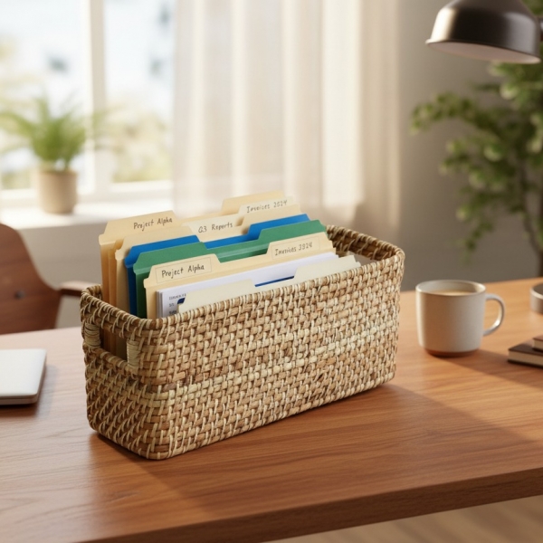 This elegantly crafted rattan storage bin offers a stylish and practical solution for home organization. Made from natural woven rattan, its sturdy rectangular design features integrated cut-out handles for easy portability. Perfect for decluttering any space, this versatile basket seamlessly blends with various interior styles, from boho chic to modern minimalist. Use it to neatly store magazines, remote controls, towels, craft supplies, or pantry essentials, adding a touch of natural texture and warmth to your living room, bedroom, bathroom, or office. Its timeless aesthetic and durable construction make it an ideal choice for enhancing both functionality and decor.