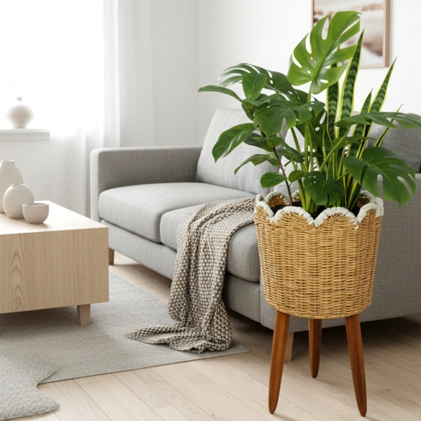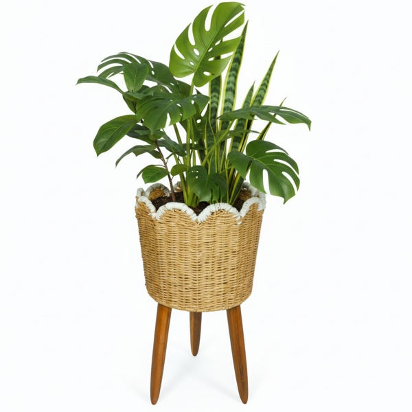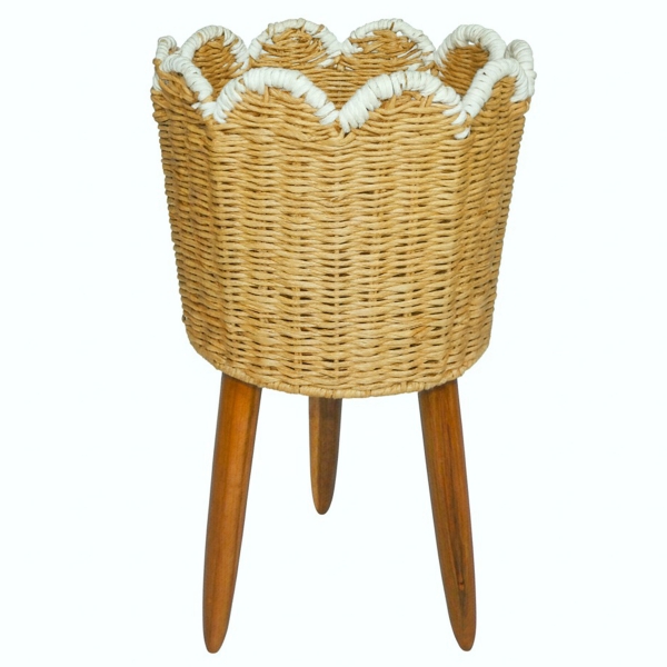 This stylish mid-century modern paper rope planter features a unique scallop-edged design, providing a chic and natural aesthetic to any indoor space. Crafted from intricately woven paper rope in a warm, natural hue, the planter basket sits atop three elegantly tapered wooden legs, elevating its presence. The distinctive white detailing along the scalloped rim adds a touch of bohemian charm and visual interest. Perfect for showcasing your favorite houseplants or decorative foliage, this freestanding planter seamlessly blends functionality with contemporary design. Its compact size and versatile style make it an ideal accent piece for living rooms, bedrooms, or sunrooms, adding a touch of organic elegance to your home decor.