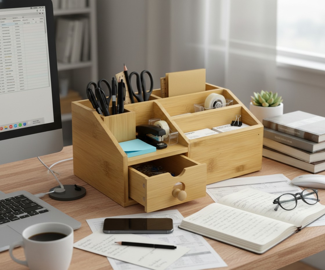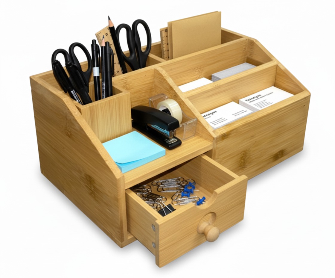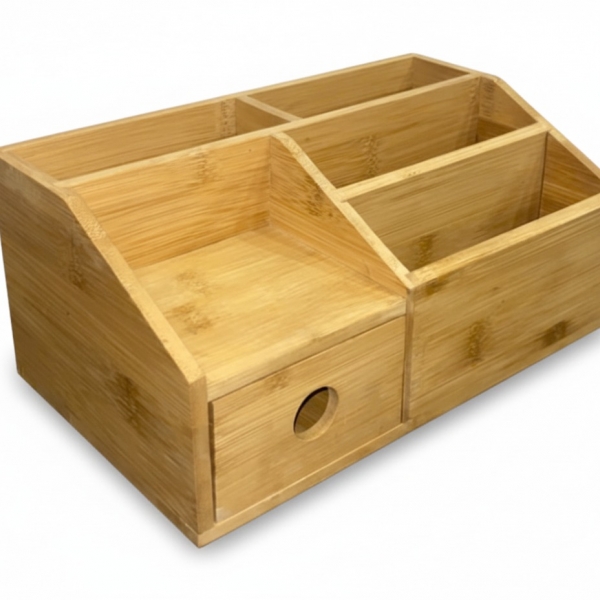 This versatile bamboo desktop organizer offers a stylish and eco-friendly solution for decluttering any workspace or home area. Crafted from sustainable bamboo, its natural wood finish brings warmth and sophistication. Featuring multiple compartments of varying sizes, it's perfectly designed to hold office supplies like pens, pencils, sticky notes, and paper clips, keeping them neatly arranged and easily accessible. A convenient pull-out drawer provides discreet storage for smaller essentials or personal items, maintaining a tidy appearance. Ideal for enhancing productivity in a home office, study, or even a kitchen, this durable and compact organizer seamlessly blends functionality with minimalist design, making it a must-have for modern living and efficient organization.