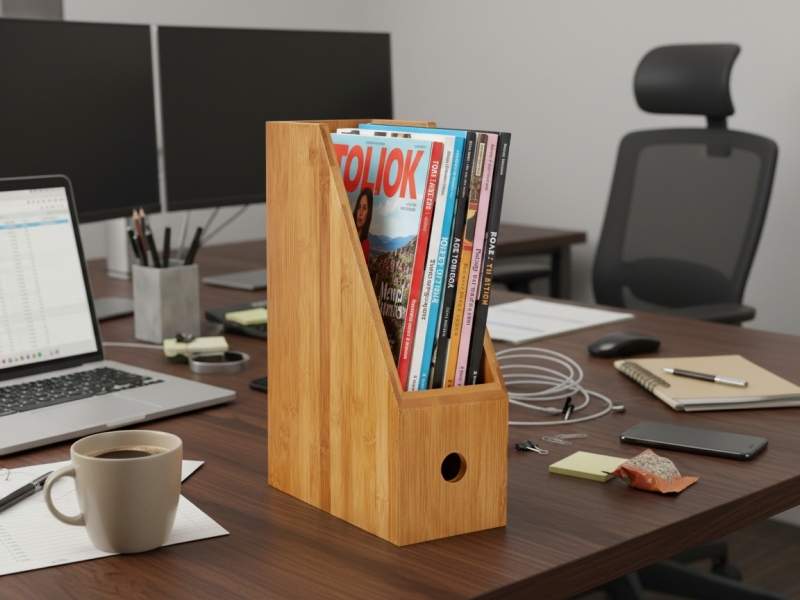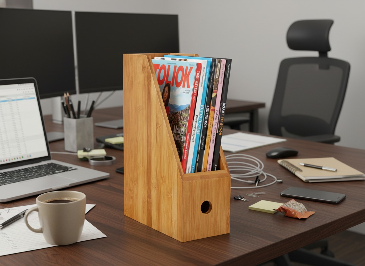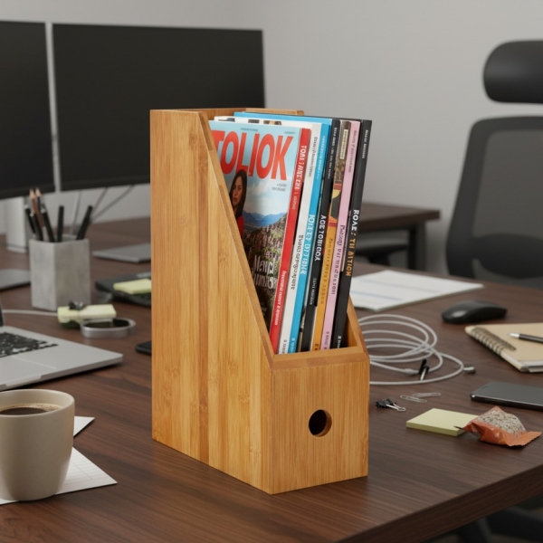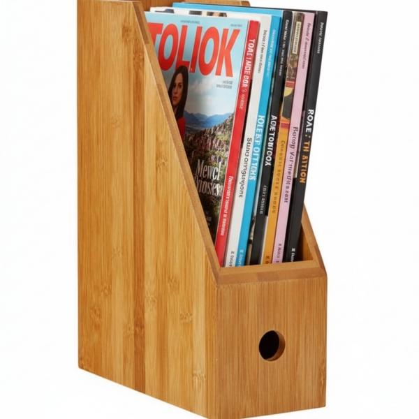 Organize your workspace with this elegant bamboo magazine holder, a perfect blend of natural aesthetics and practical functionality. Crafted from sustainable bamboo, this file organizer features a warm, natural wood grain finish that adds a touch of eco-friendly sophistication to any office or home setting. Its sturdy construction is designed to keep magazines, documents, notebooks, or folders neatly upright and easily accessible. The thoughtful design includes a convenient circular cutout handle on the front for effortless transport and repositioning. Ideal for decluttering desks, shelves, or countertops, this stylish bamboo storage solution promotes a tidy environment, enhancing productivity and reducing visual clutter. A versatile and sustainable choice for modern homes and offices seeking efficient and beautiful organization.