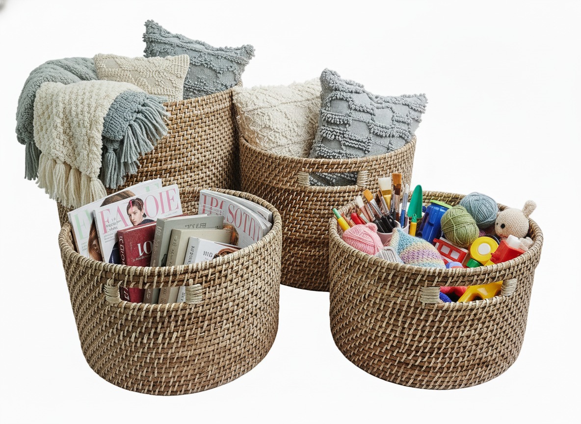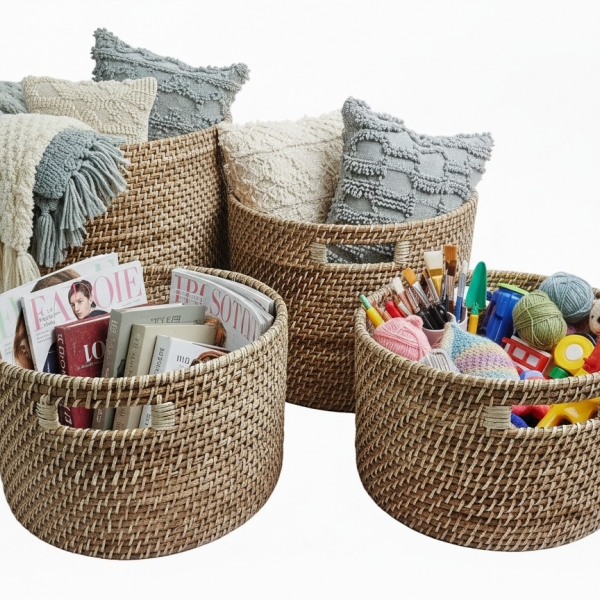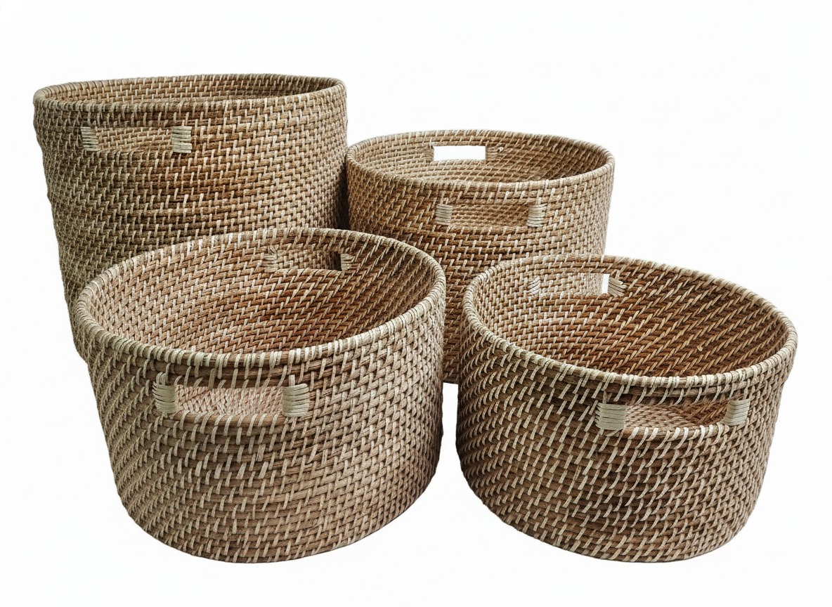 Discover this exquisite set of four rattan storage baskets, showcasing a beautiful natural woven design. Each basket, varying in size, features sturdy, integrated handles for easy carrying and relocation. The unique two-tone weave, combining light brown and beige hues, adds a touch of bohemian elegance and rustic charm to any interior. Perfect for decluttering and organizing various spaces, these versatile baskets seamlessly blend functionality with aesthetic appeal. Use them to store blankets, toys, magazines, or laundry, enhancing your home's decor with their organic texture and artisanal craftsmanship. Ideal for both contemporary and traditional settings, these durable rattan baskets offer a stylish solution for everyday storage needs, elevating your home organization game.