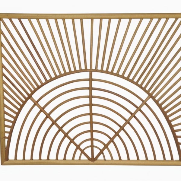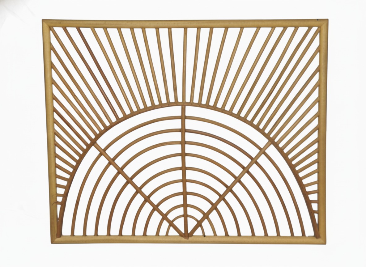 Discover this exquisite natural rattan decorative panel, boasting a captivating semi-circular sunburst design. Crafted from sustainable light brown rattan, this rectangular piece exudes a warm, bohemian aesthetic perfect for elevating any modern interior. Its intricate openwork pattern, reminiscent of a rising sun or an elegant fan, creates a striking visual focal point. Versatile in its application, this handcrafted screen can serve as a stylish headboard for a queen or king-sized bed, a unique wall art piece in a living room, or a chic room divider, adding texture and organic charm to your space. Embrace natural materials and a serene ambiance with this trending decor item, ideal for both USA and European contemporary homes seeking a touch of artisanal sophistication and eco-friendly design.