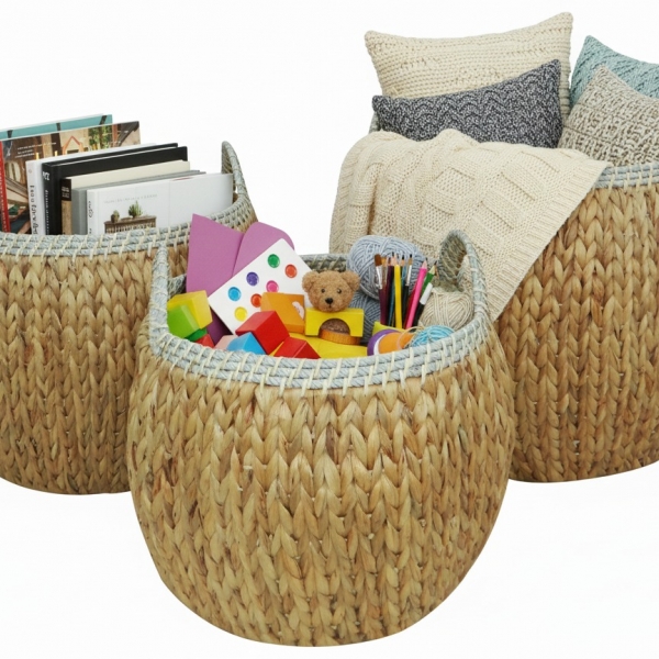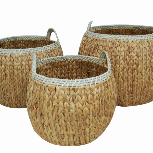 Round water hyacinth storage basket with rope rim, set of 3 pcs