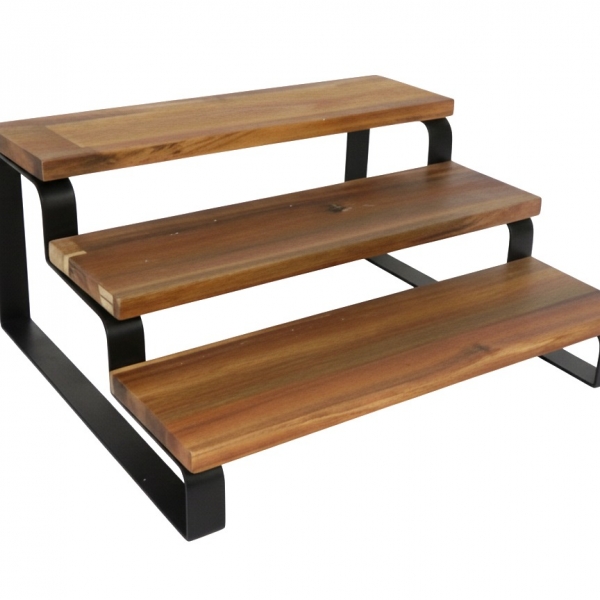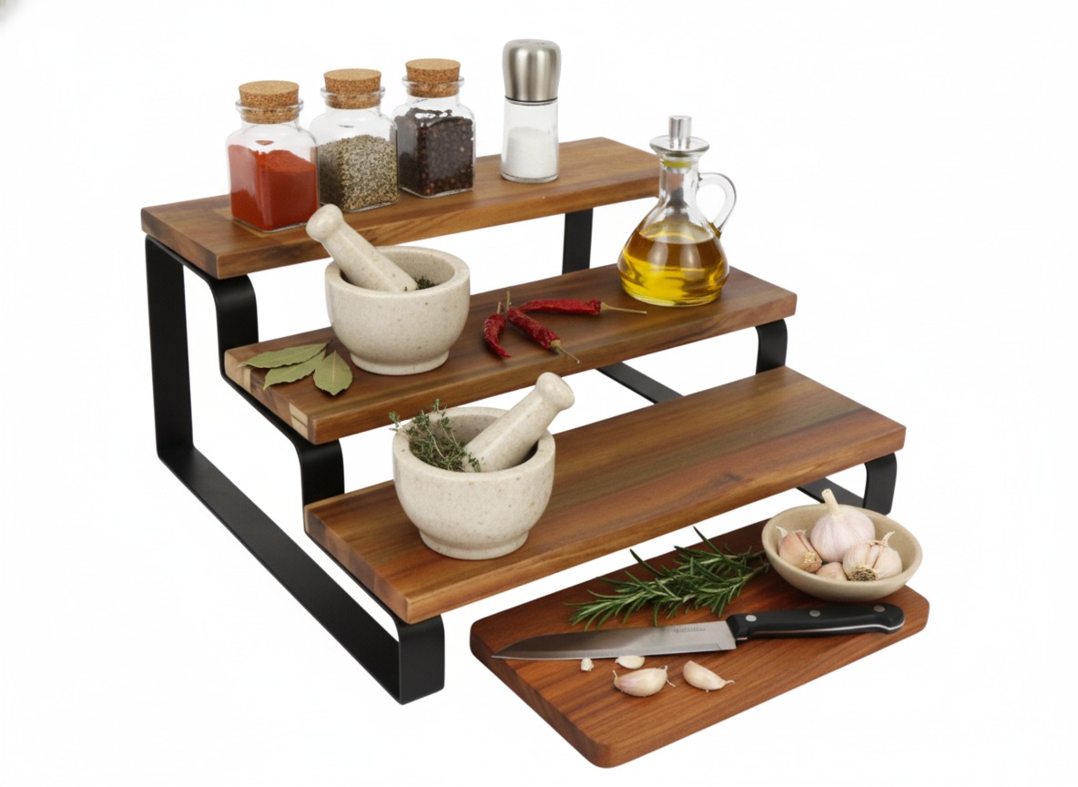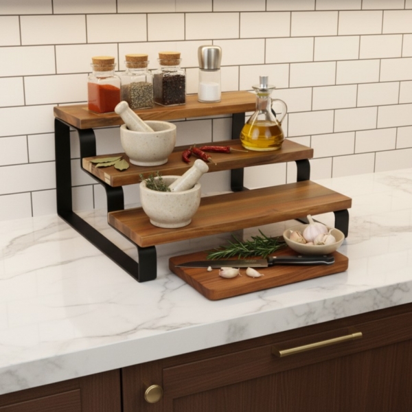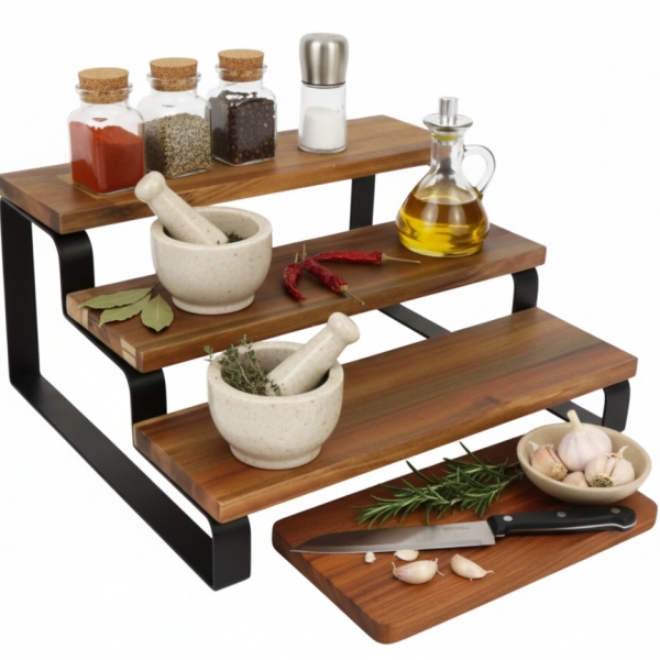 This elegant three-tier display stand, crafted from rich acacia wood and supported by a robust black metal frame, offers a perfect blend of rustic charm and modern industrial design. Ideal for decluttering and organizing, its stepped design maximizes vertical storage and ensures excellent visibility for all items placed on its shelves. The natural warmth of acacia wood grain makes it a stylish addition to any kitchen countertop, pantry, or even a bathroom vanity. Whether used to display spices, small plants, essential oils, or cherished collectibles, this versatile unit enhances both functionality and aesthetic appeal. It's a chic "acacia kitchen helper" designed to keep your spaces tidy and beautifully presented, fitting seamlessly into contemporary or traditional home decors across USA and European markets.
