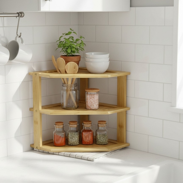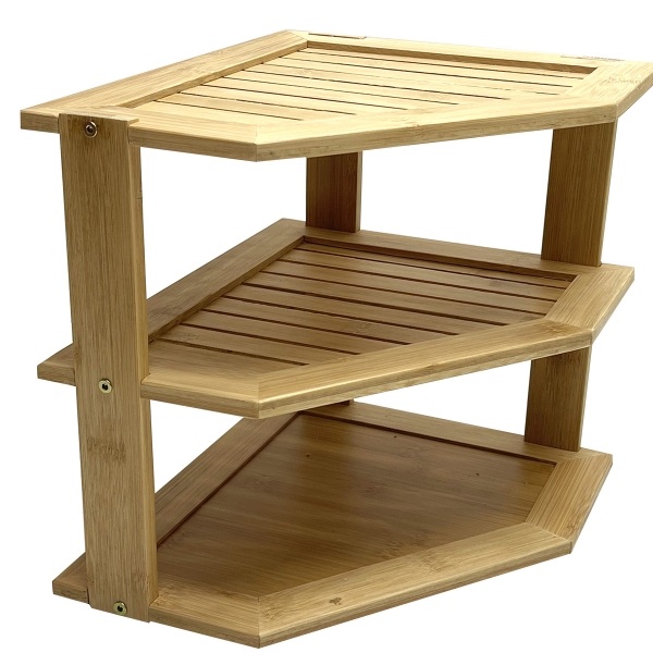 This elegant three-tier bamboo corner shelf unit offers a practical and stylish solution for optimizing space in any room. Crafted from durable, light-toned bamboo, its natural wood grain provides a warm, inviting aesthetic that complements various interior designs, from modern minimalist to rustic farmhouse. The unique triangular design is specifically engineered to fit snugly into corners, transforming often-unused areas into valuable storage or display zones. Featuring two slatted shelves perfect for ventilation and a solid bottom shelf for added stability, this versatile organizer is ideal for bathrooms to hold toiletries, towels, or plants. It can also enhance kitchen countertops for spices or small appliances, or add functional decor to a living room for displaying books, small decor pieces, or collectables. Easy to assemble and maintain, this freestanding shelf unit is a sustainable choice for decluttering and beautifying your home.