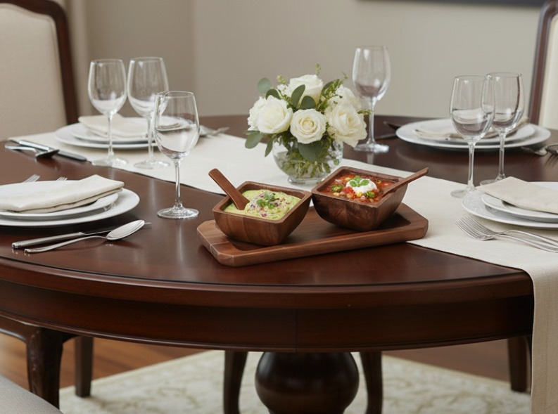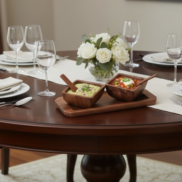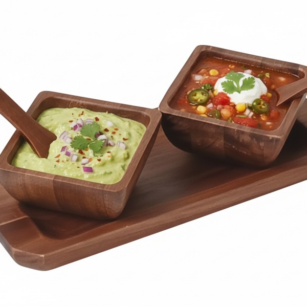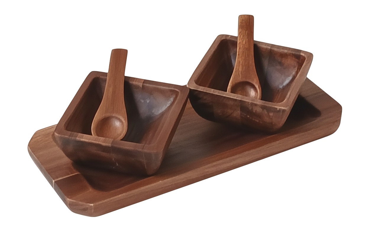 This elegant two-piece wooden serving set, presented on a matching rectangular tray, offers a perfect blend of rustic charm and functional design for any home. Crafted from rich, dark-grained wood, possibly acacia or teak, the set features two square-shaped bowls, each accompanied by its own small, perfectly sized wooden spoon. The warm tones and natural textures of the wood make it a versatile addition to various decor styles, from modern minimalist to bohemian chic. Ideal for entertaining, this stylish condiment holder is perfect for serving an array of dips, sauces, spices, nuts, olives, or small appetizers. Its compact design ensures it fits beautifully on any table, kitchen counter, or dining spread, making it a thoughtful gift or a sophisticated upgrade to your own kitchenware collection. Enhance your dining experience with this beautifully crafted, durable wooden serveware.