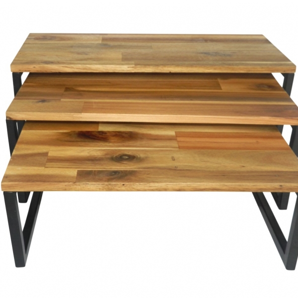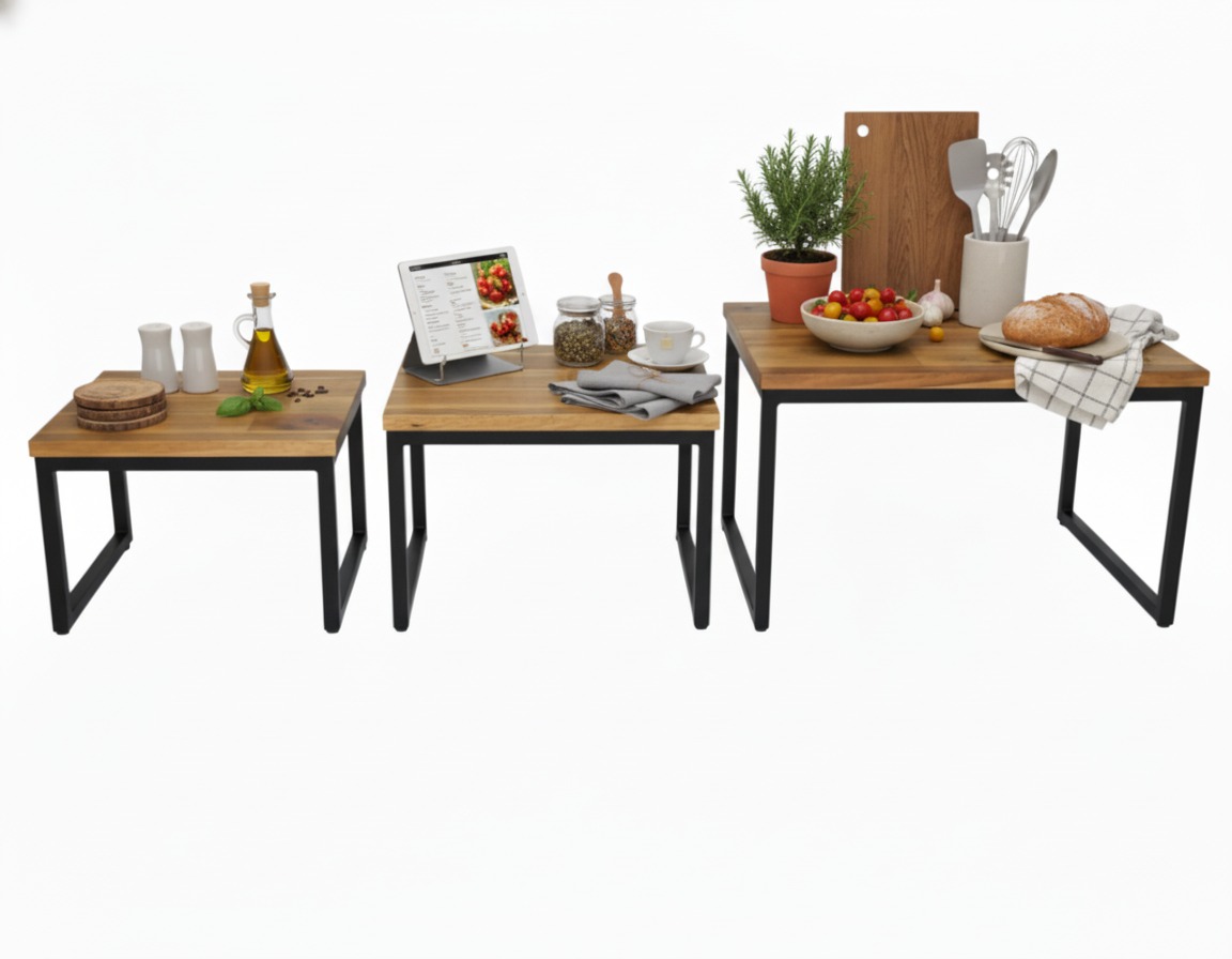 Elevate your home's aesthetic with this stunning 3-piece acacia wood kitchen shelf set, featuring robust black metal frames that exude a modern industrial charm. Each shelf boasts a beautifully variegated acacia wood surface, known for its durability and rich grain patterns, making every piece unique. This versatile nesting design allows for flexible arrangement, whether used together as a tiered display or individually as accent tables or compact storage solutions. Perfect for organizing spices, cookbooks, small appliances, or displaying decorative items in the kitchen, living room, or entryway. Its sleek lines and mixed-material construction offer a contemporary touch that complements various interior styles, from farmhouse to urban loft. A functional yet stylish addition, these shelves provide ample space while maintaining a minimalist footprint.