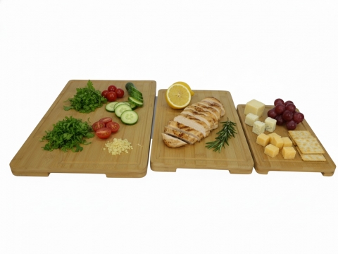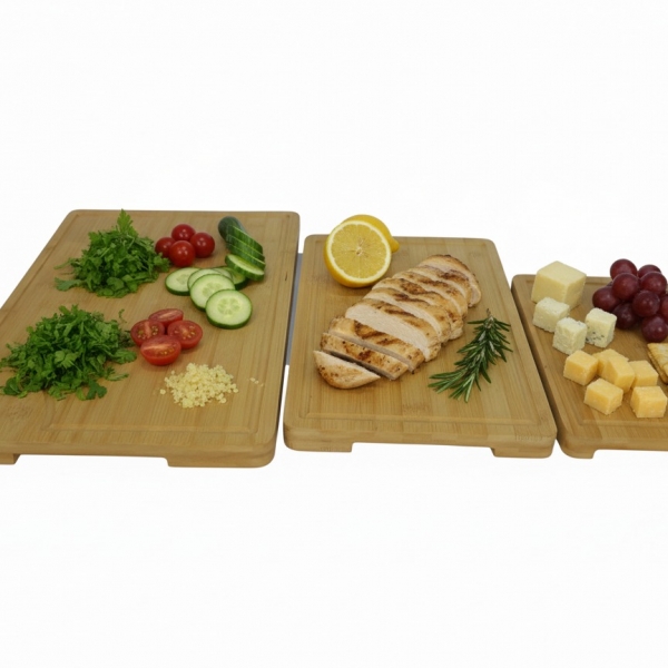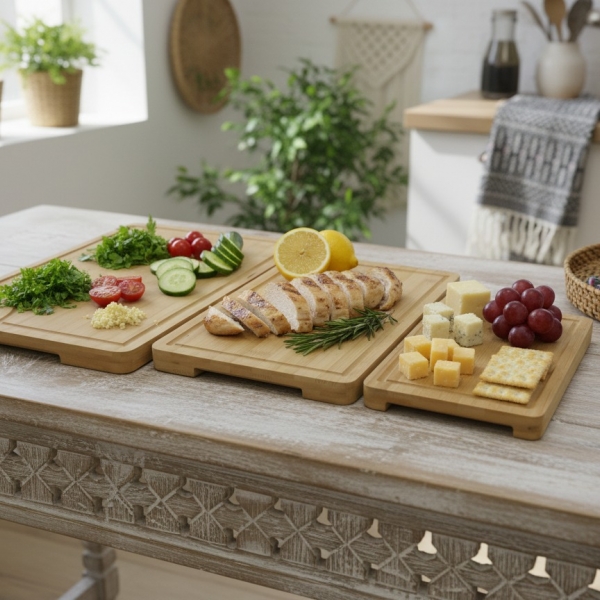 Being excited with this versatile 3-piece bamboo cutting board set, perfect for any modern kitchen. Crafted from sustainable and durable bamboo, these chopping boards offer a natural, eco-friendly solution for all your food preparation needs. The set includes three different sizes, providing ample space for slicing vegetables, dicing meats, or serving appetizers with style. Each board features a practical juice groove to prevent spills and maintain a clean countertop. Ideal for both everyday cooking and special occasions, these lightweight yet robust cutting boards are a must-have for home chefs and culinary enthusiasts. Elevate your kitchen aesthetic while embracing functionality and sustainability with this elegant bamboo board collection. Easy to clean and maintain, they are designed for longevity and reliable performance.