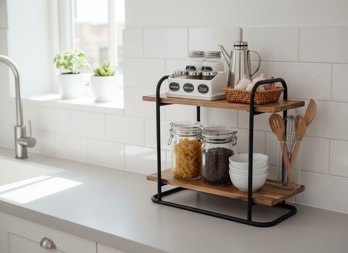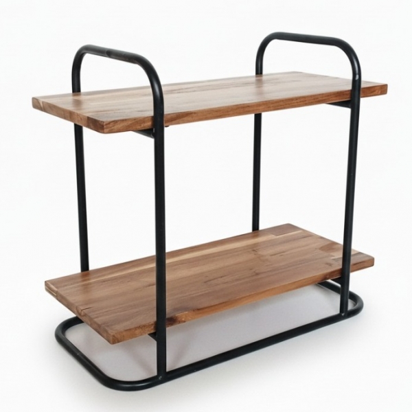 Introduce this elegant two-tier acacia wood kitchen helper, a versatile and stylish storage solution for any modern home. Crafted with rich, natural acacia wood shelves and a sleek black metal frame, this compact organizer seamlessly blends industrial charm with organic warmth. Ideal for decluttering countertops or adding functional decor, its sturdy design is perfect for displaying spices, holding small appliances, or organizing pantry essentials. The minimalist aesthetic makes it suitable for various interior styles, from contemporary to rustic farmhouse. Elevate your kitchen's functionality and visual appeal with this beautifully designed and durable acacia wood organizer, perfect for adding a touch of sophisticated utility.