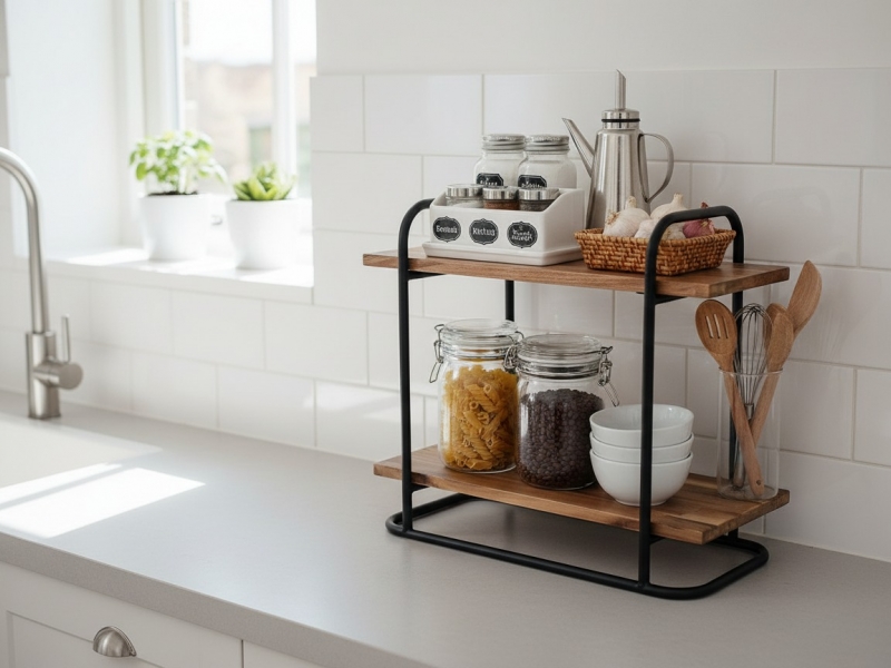 Elevate kitchen organization and aesthetics with our premium two-tier acacia wood shelf, designed for both durability and style.
