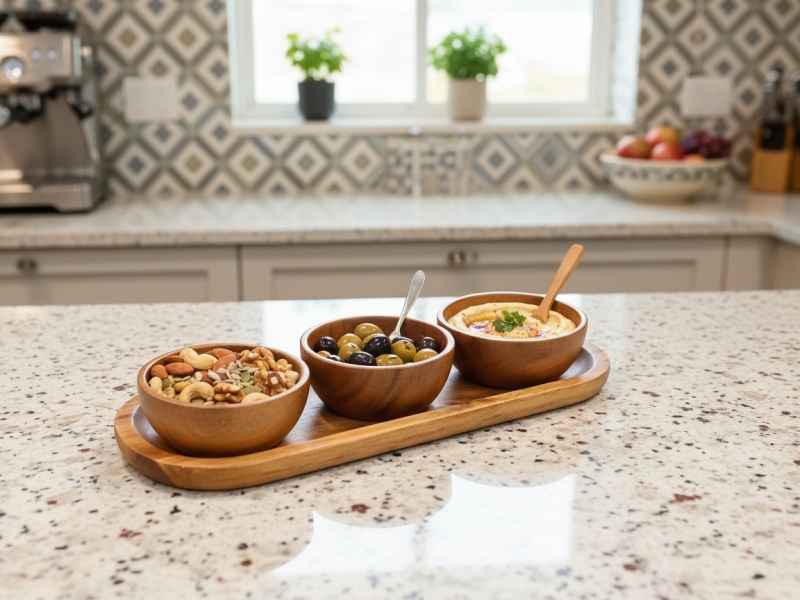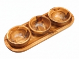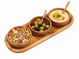 Discover the elegance of this beautifully crafted wooden serving tray, featuring three integrated bowls perfect for entertaining or everyday use. Made from rich, natural wood, possibly acacia, this versatile piece showcases unique grain patterns and a warm, inviting tone that complements any decor style, from modern farmhouse to minimalist. Ideal for serving a variety of appetizers, dips, nuts, olives, or condiments, it brings a touch of rustic charm and sophistication to your dining table, coffee table, or buffet spread. Its compact and practical design ensures easy handling and storage, making it a must-have for hosts who appreciate both functionality and aesthetic appeal. Elevate your culinary presentations and impress your guests with this eco-friendly and stylish serving solution.