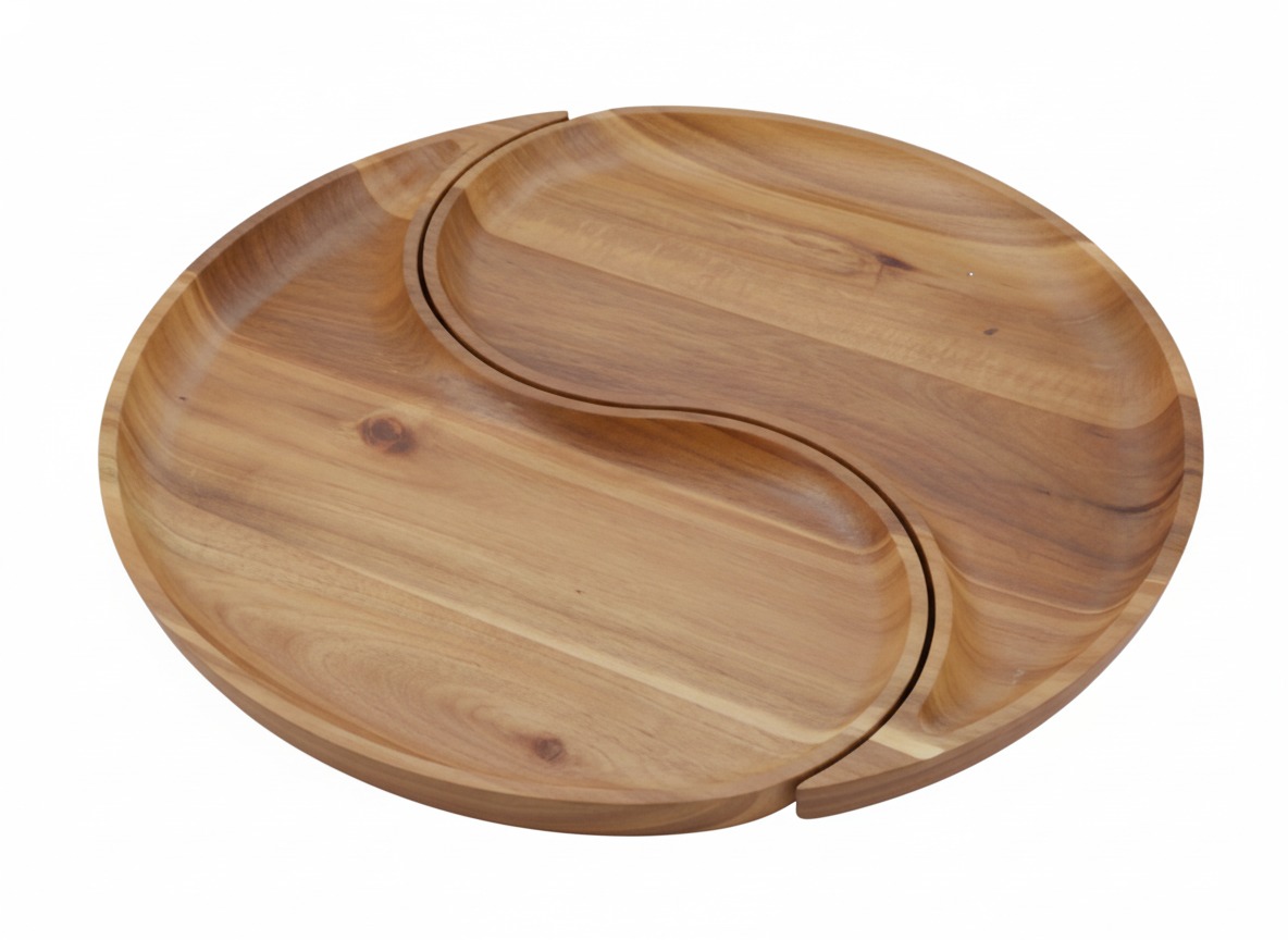 Discover this exquisite Acacia wood serving platter, beautifully designed in a captivating Yin Yang style. This natural wood piece features two distinct, interlocking compartments, perfect for elegantly presenting a variety of appetizers, snacks, or condiments. Its smooth, rich grain and durable construction make it a functional yet stylish addition to any kitchen or dining setting. Ideal for entertaining guests or simply adding a touch of sophisticated, organic charm to your home decor. The eco-friendly acacia wood ensures a sustainable choice for your serveware collection, combining aesthetic appeal with practical utility for everyday use or special occasions. Enhance your culinary presentation with this unique, versatile tray.