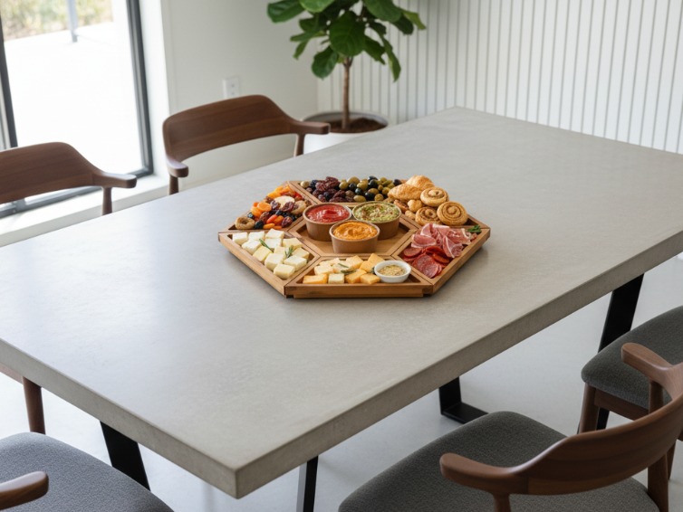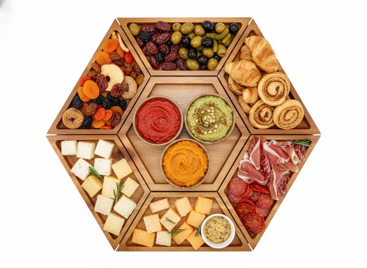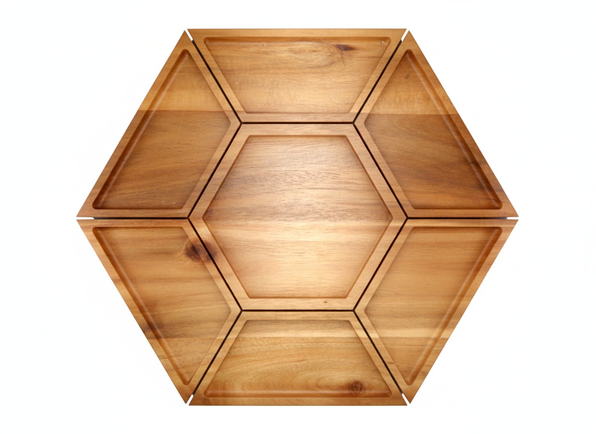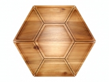 This elegant, modular wooden serving platter set offers a versatile and stylish solution for your entertaining needs. Crafted from beautiful acacia wood, the natural grain and warm tones enhance any decor, from modern minimalist to rustic farmhouse. The innovative design features a central hexagonal tray surrounded by six interlocking triangular segments, allowing for various configurations to suit different occasions and guest numbers. Perfect for serving an assortment of appetizers, nuts, candies, fruits, or cheese and crackers, this sectional platter is ideal for dinner parties, holiday gatherings, or everyday use. Its unique hexagonal shape not only adds a touch of sophistication to your table but also promotes easy organization of different food items. A must-have for anyone who loves to host.