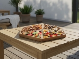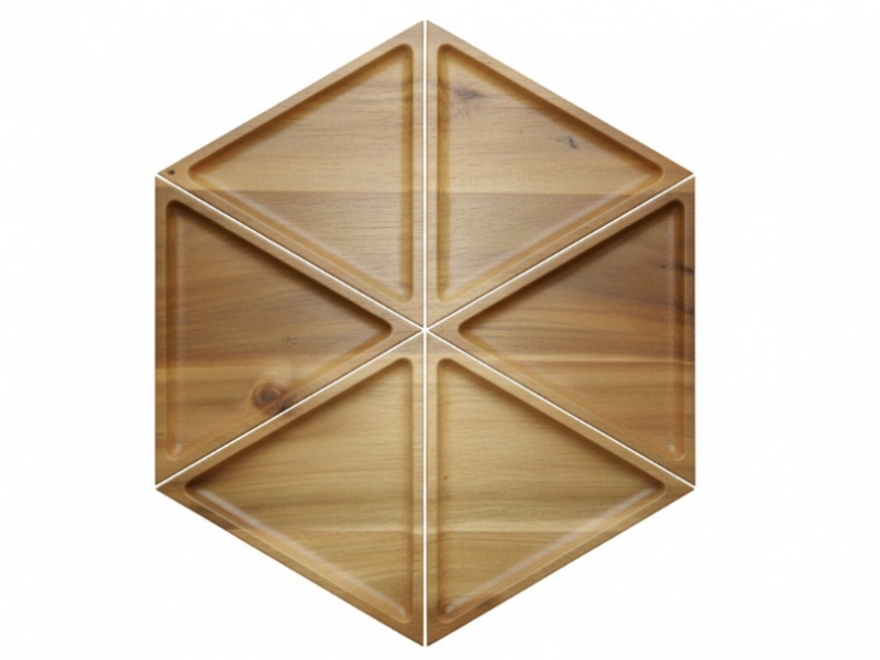 This unique hexagonal wooden serving tray brings modern elegance to any setting. Crafted from beautiful acacia wood, it features six triangular compartments, perfect for organizing and presenting a variety of snacks, appetizers, or decorative items. The natural wood grain and warm tones offer a rustic yet contemporary appeal, complementing diverse interior styles from minimalist to farmhouse chic. Ideal for entertaining guests or simply adding a touch of sophisticated organization to your home, this versatile tray is both functional and visually striking. Its modular design allows for creative food presentation, making it a standout piece for gatherings, parties, or everyday use.