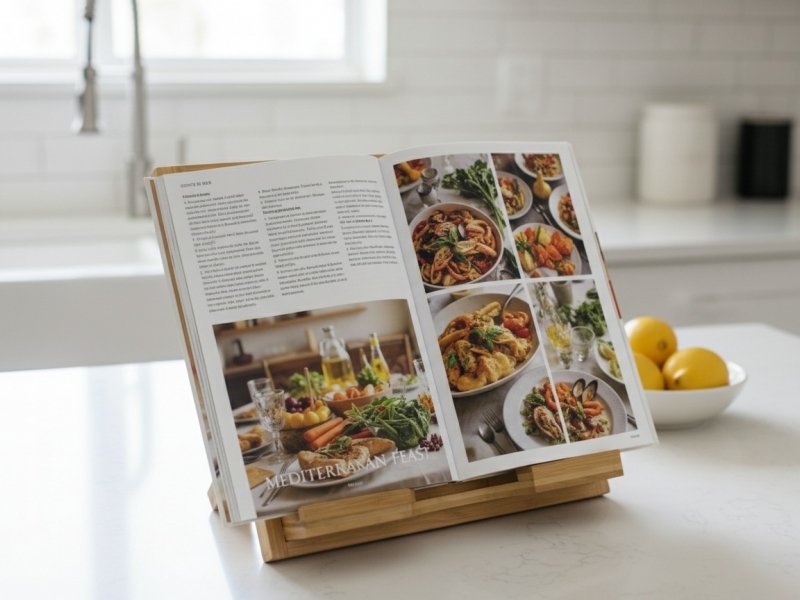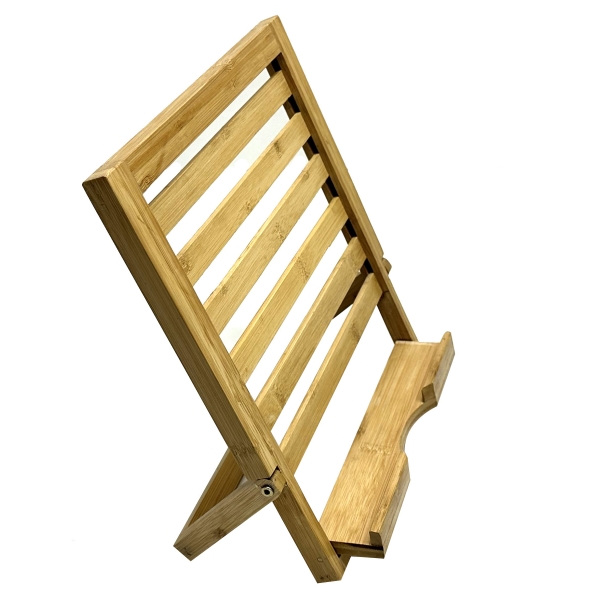 Showcasing a versatile and eco-friendly bamboo cookbook stand, this image captures the item from a dynamic, slightly angled perspective against a clean white background. Crafted from sustainably sourced bamboo, the stand features a slatted design on its adjustable backrest, providing optimal airflow and a modern aesthetic. Its sturdy construction ensures a reliable perch for cookbooks, tablets, or recipe cards, keeping them open and visible while cooking. The front lip holds items securely, preventing slips. Ideal for enhancing kitchen organization, this natural wood stand promotes hands-free reading, reducing clutter and improving ergonomic comfort. It’s a stylish and practical addition to any culinary space, perfect for home chefs seeking both functionality and sustainable design.