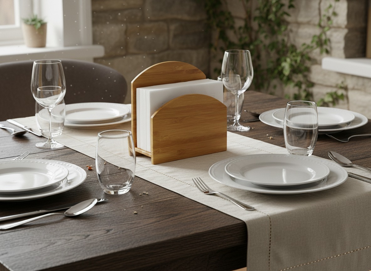 This elegant bamboo napkin holder offers a stylish and eco-friendly solution for organizing your dining table or kitchen counter. Crafted from natural, sustainable bamboo, its warm, light wood tone and distinctive grain add a touch of minimalist sophistication to any decor. The sturdy design features two compartments, making it versatile enough to hold napkins, letters, mail, or even small recipe cards, keeping them tidy and easily accessible. Its compact size ensures it fits perfectly in various settings, from casual family meals to more formal gatherings. Ideal for contemporary homes, this durable and aesthetically pleasing organizer combines practicality with a commitment to sustainable living, enhancing your space with natural beauty and effortless organization. Perfect for modern kitchens and dining areas.