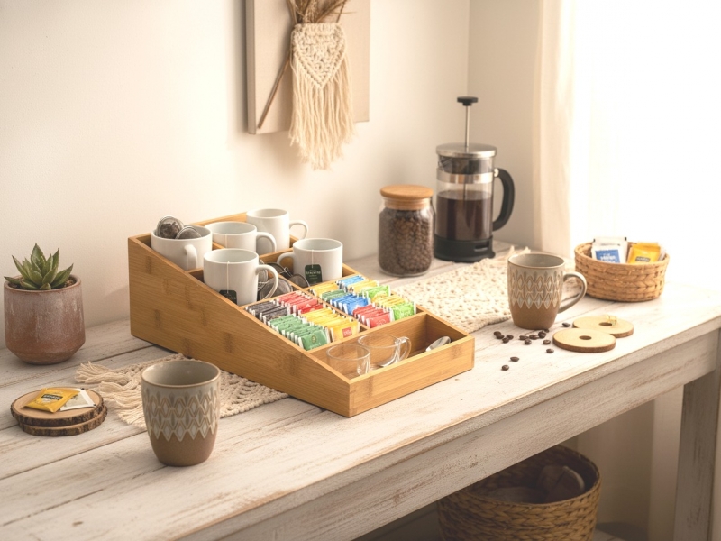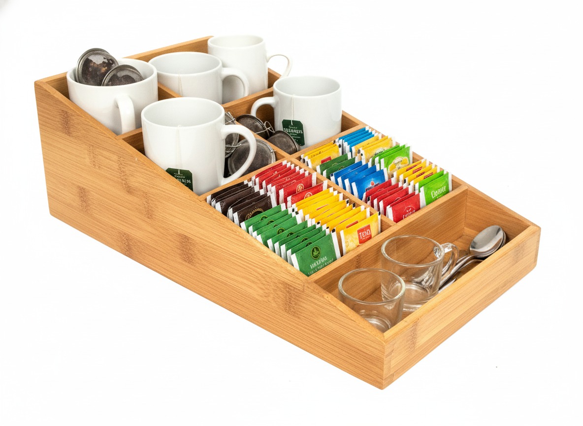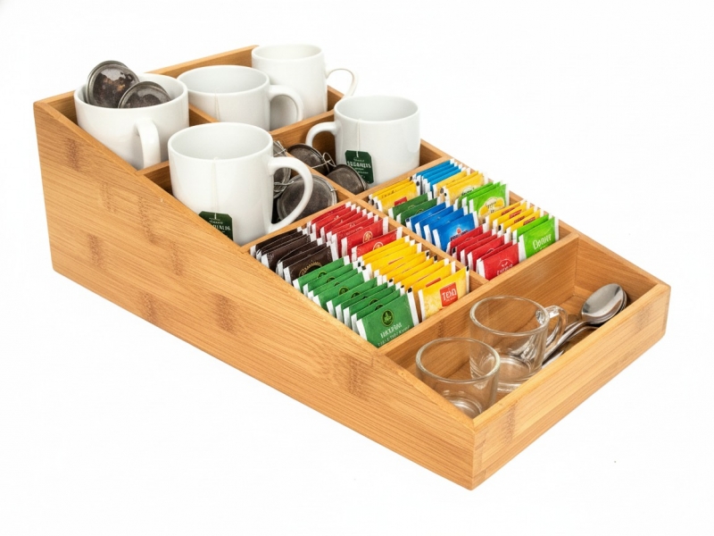 Be surprised by this versatile bamboo organizer, perfect for decluttering any space. Featuring multiple compartments, its natural wood finish brings an eco-friendly touch to your home or office. Ideal for organizing tea bags, coffee pods, office supplies, or craft essentials, this tiered storage solution offers easy access and visibility. Its compact and stylish design fits seamlessly on countertops, desks, or in breakrooms, promoting a tidy and aesthetically pleasing environment. Crafted from sustainable bamboo, it's a durable and practical choice for anyone seeking efficient and natural home organization solutions, appealing to conscious consumers in USA and European markets.