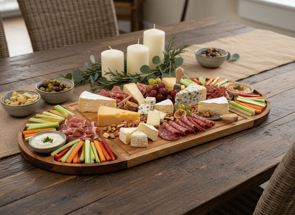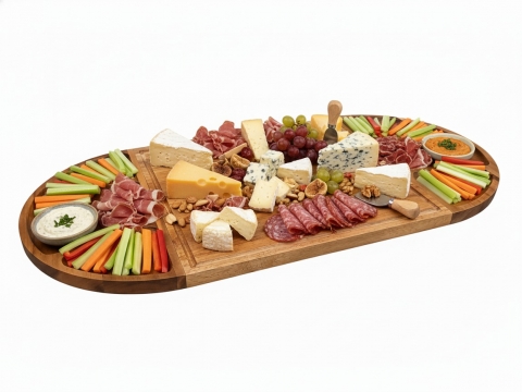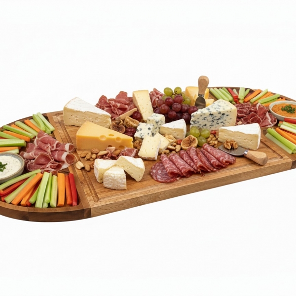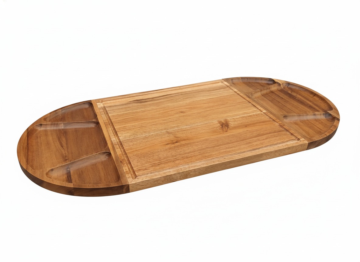 This beautifully crafted acacia wood platter offers both elegance and functionality for any home. Its distinctive oval shape features a large central cutting or serving area, perfectly framed by multiple carved compartments ideal for various accompaniments. The rich, warm tones and natural grain of the acacia wood make it a stylish addition to entertaining, perfect for showcasing charcuterie, cheeses, fruits, or appetizers. Designed for versatility, this durable wooden board is excellent for hosting dinner parties, casual gatherings, or as a sophisticated kitchen accessory. Its robust construction ensures long-lasting use, blending seamlessly with modern and rustic decor styles, making every serving experience a delightful one.