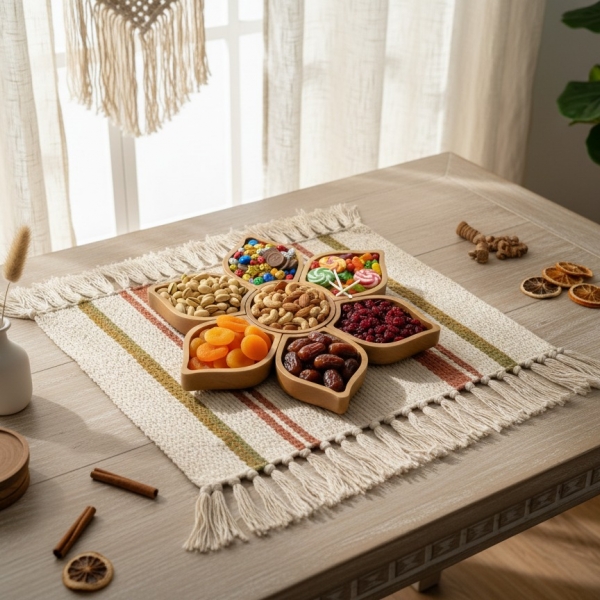 Bring home the timeless elegance of this exquisite flower-shaped acacia wood serving platter, designed to elevate your entertaining experience. Crafted from rich, natural acacia wood, this multi-compartment dish features a central circular section surrounded by six petal-like compartments, perfect for a diverse array of snacks and appetizers. Its beautiful grain and smooth finish bring a touch of rustic elegance and modern sophistication to any table setting, whether for casual gatherings or formal events. Ideal for serving nuts, dried fruits, cheeses, olives, or dips, this decorative and functional piece is a must-have for hosts looking to impress. The unique, nature-inspired design makes it a stunning centerpiece for your dining room, coffee table, or buffet spread. A truly versatile and stylish addition to your home decor and kitchenware collection.