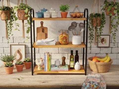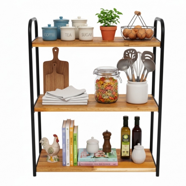 Discover this elegant and functional 3-tier acacia kitchen shelf, perfect for enhancing any home decor. Crafted with durable acacia wood shelves and a sleek black metal frame, this industrial-inspired unit offers versatile storage and display options. Its compact design makes it ideal for maximizing space in kitchens, pantries, or dining areas. Use it to organize spices, cookbooks, small appliances, or decorative items. The natural wood grain of the acacia adds a touch of rustic charm, while the sturdy metal ensures stability and longevity. An essential piece for modern farmhouse, minimalist, or industrial interiors, providing both style and practicality. Enhance your home with this chic storage solution.