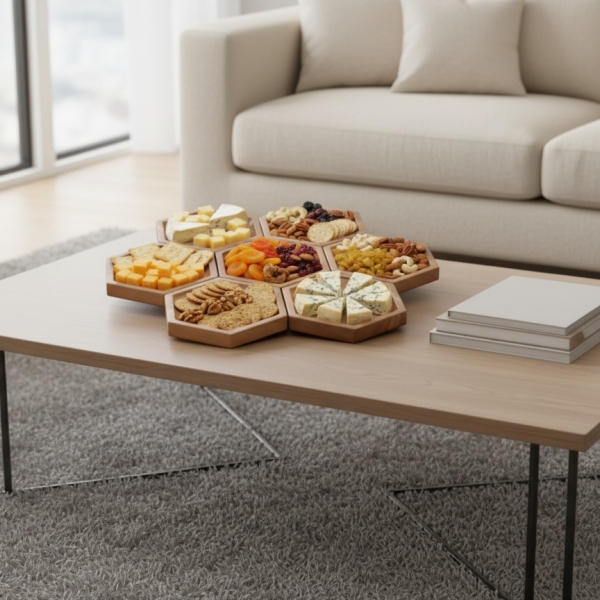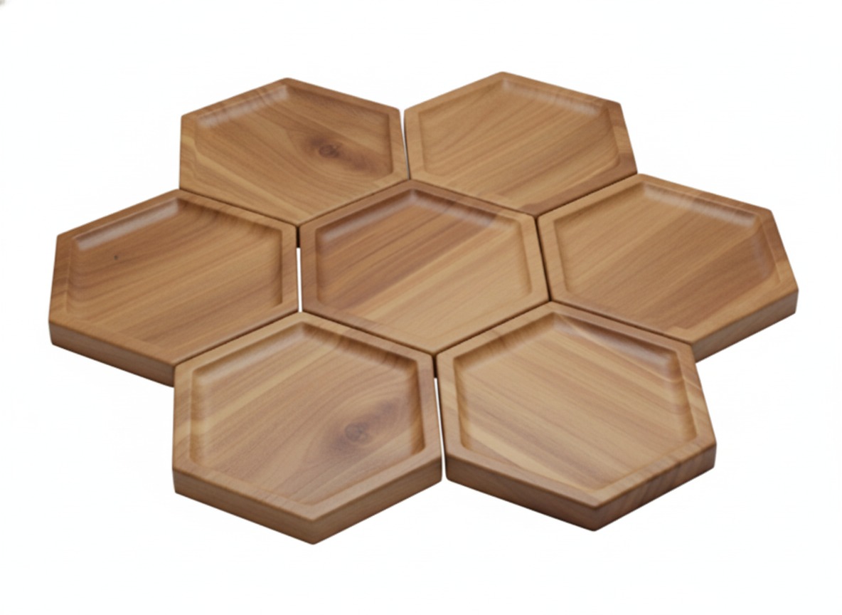 Discover this exquisite set of seven honeycomb-shaped acacia wood platters, perfect for elevating your home decor and serving needs. Each hexagonal tray showcases the natural beauty and rich grain of acacia wood, offering a warm, organic touch to any setting. Designed for versatility, these stylish wooden trays can be arranged together to create a striking centerpiece or used individually for serving appetizers, desserts, or small bites. Their unique interlocking design allows for creative configurations, making them ideal as decorative organizers for keys, jewelry, or office supplies. Enhance your dining experience, add a touch of rustic elegance to your living space, or present your culinary creations with these versatile and eco-friendly serving pieces. A must-have for modern homes and conscious living.