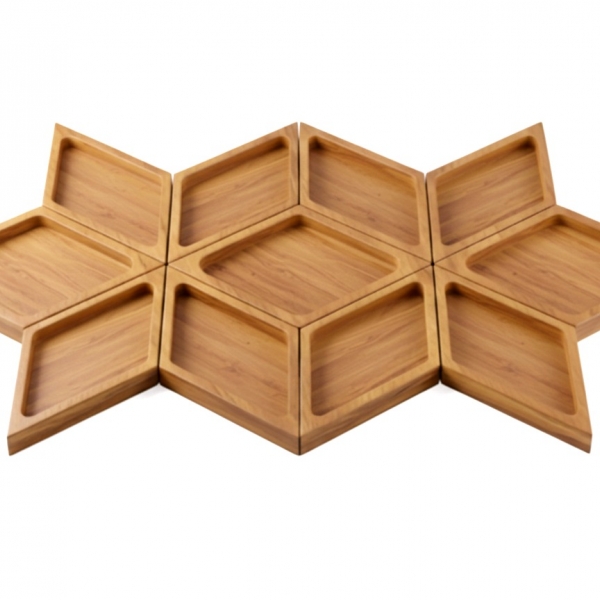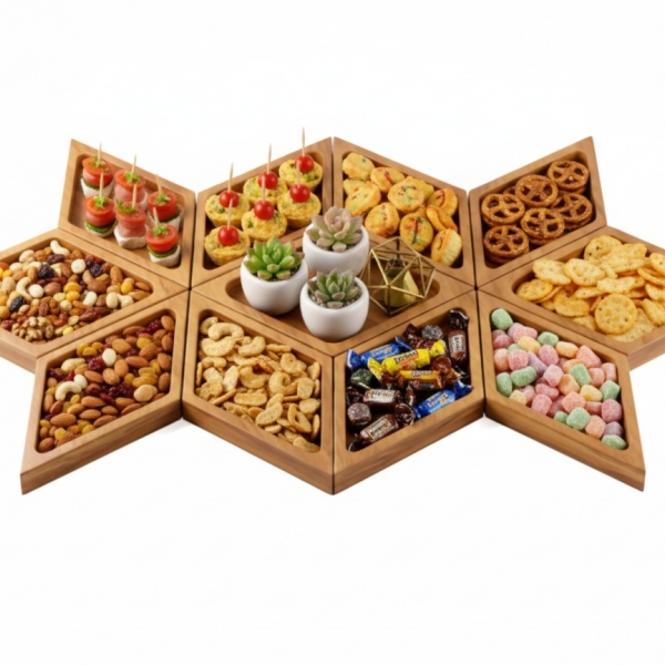 Showcasing a beautifully crafted modular serving set made from rich acacia wood, this image captures the elegance and versatility of contemporary home decor. The individual rhombus-shaped trays can be arranged in various configurations, forming a stunning hexagonal pattern or a star-like display, perfect for entertaining or daily use. Each piece highlights the natural grain and warm tones of the acacia, offering both functionality and aesthetic appeal. This eco-friendly and durable wooden set is ideal for serving snacks, appetizers, or as a sophisticated organizational solution for small items. Its unique design makes it a focal point in any room, blending modern design with natural materials for a stylish touch.