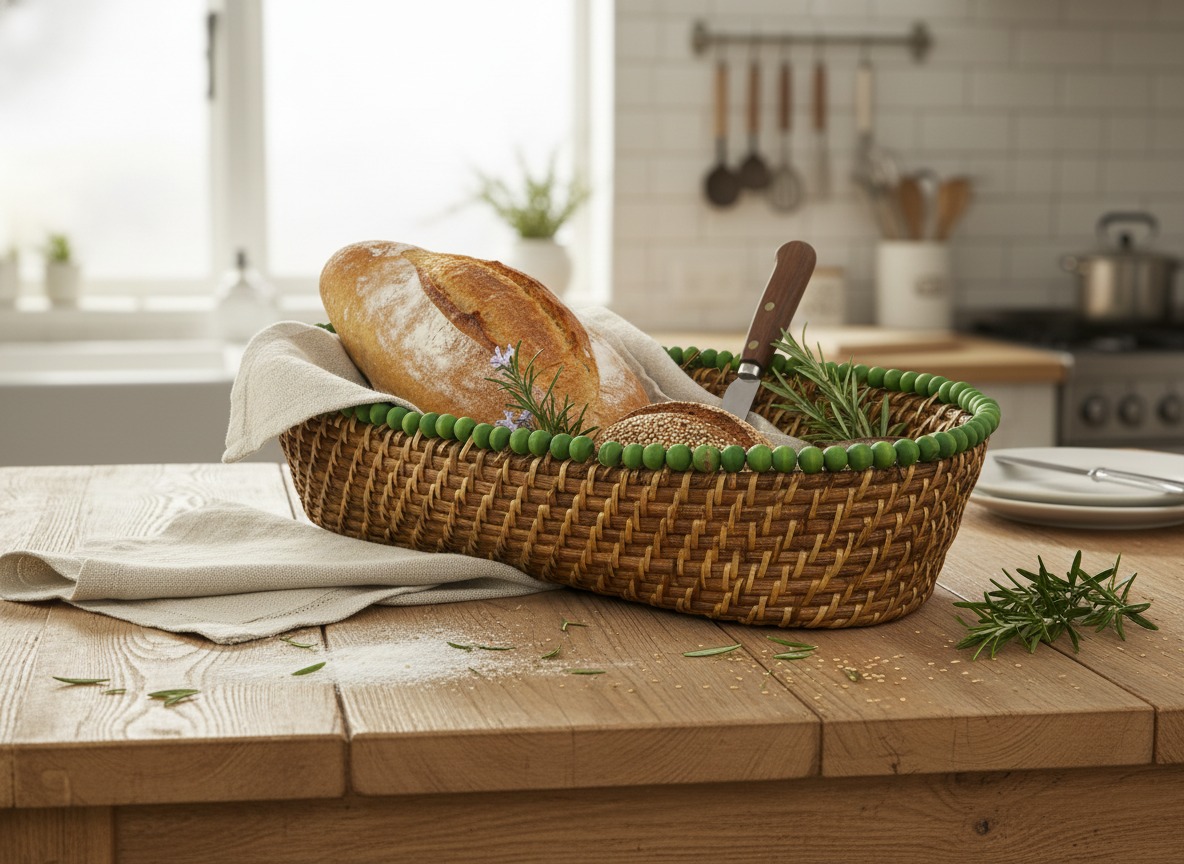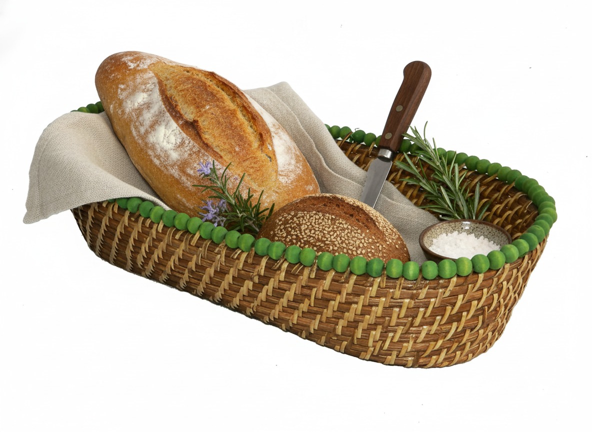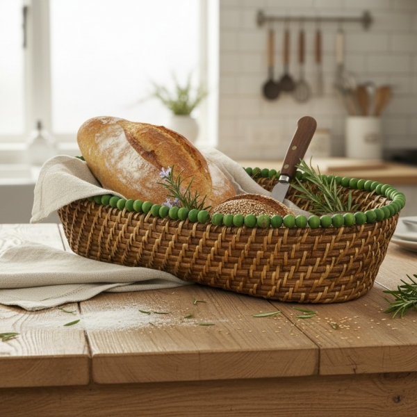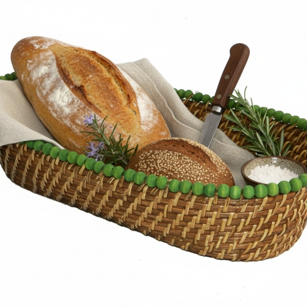 The Oval rattan bread basket with wooden beads is a charming addition to any kitchen or dining table. Handcrafted with care, this rustic-inspired basket exudes natural beauty and timeless appeal. The intricate weaving of rattan creates a sturdy yet flexible structure, perfect for holding and displaying an assortment of bread or rolls. The addition of wooden beads along the edges adds an elegant touch, enhancing the overall aesthetic. This versatile basket is not only functional but also serves as a decorative piece, elevating the presentation of your baked goods. Bring warmth and a touch of rustic elegance to your table with this exquisite bread basket.