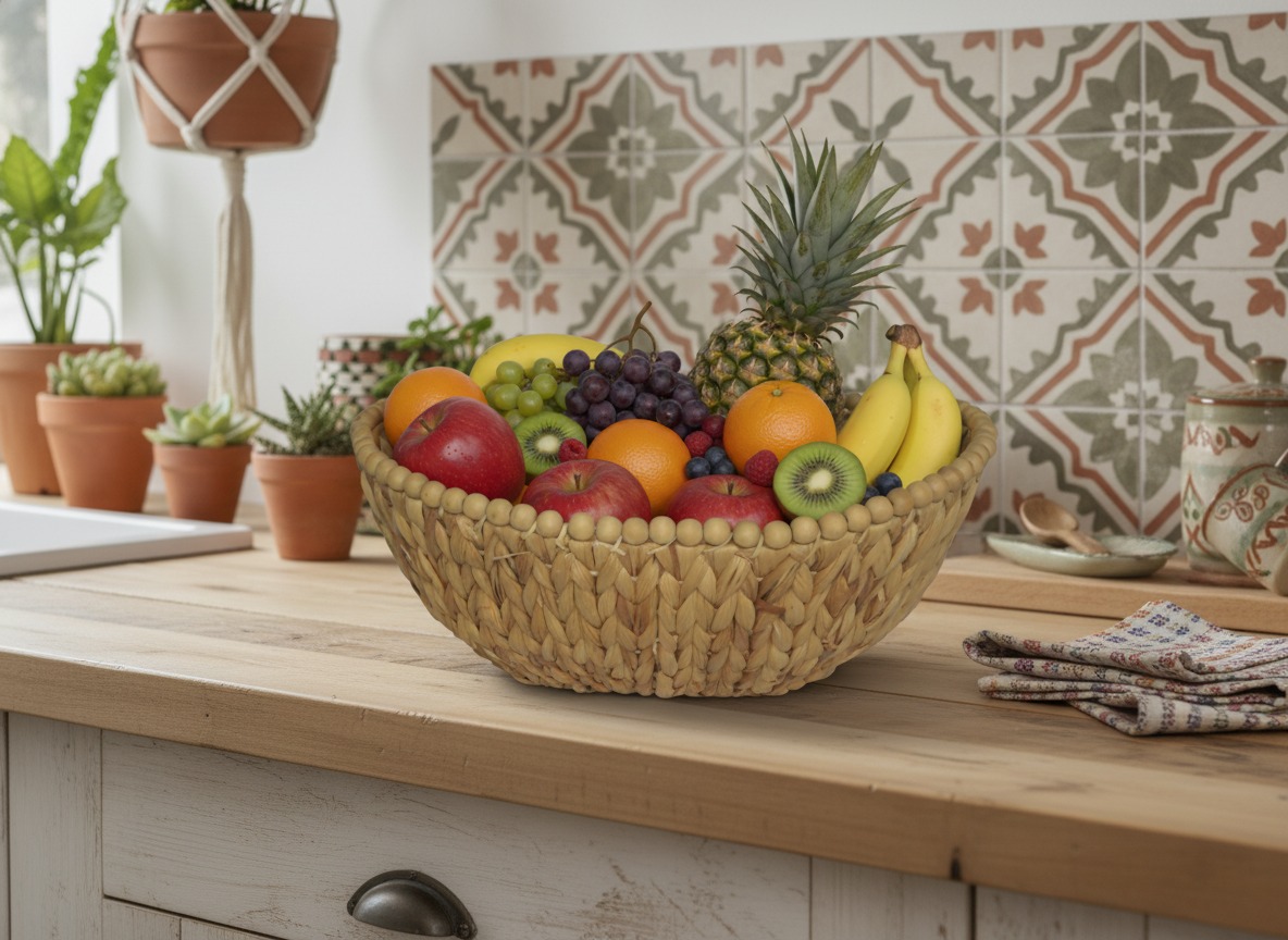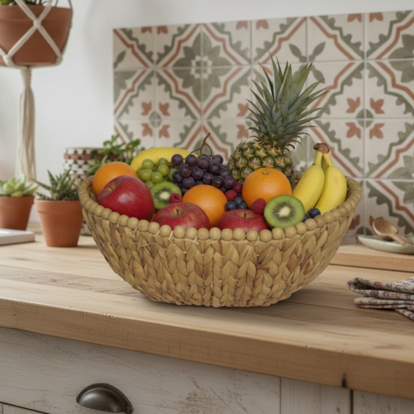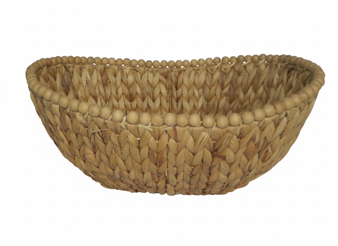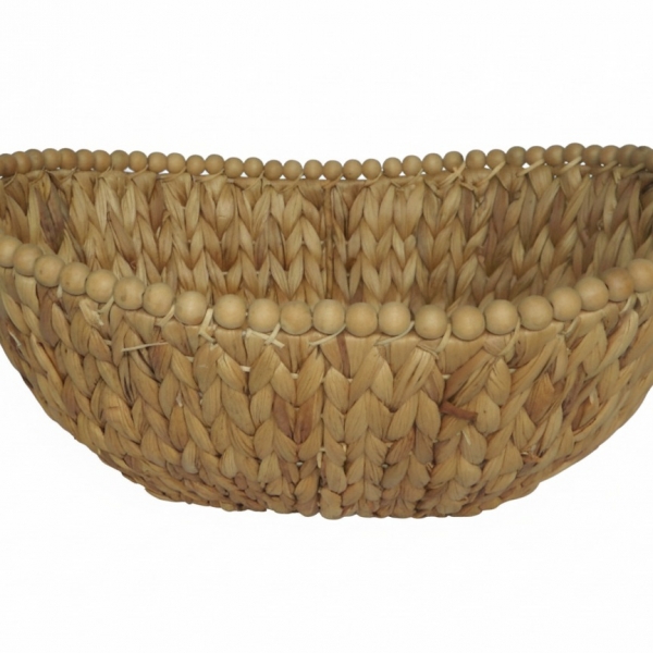 Unveil the delightful beauty inherent in this beautifully crafted oval water hyacinth bowl, perfect for adding a touch of natural elegance to any home decor. Hand-woven with sustainable water hyacinth, its textured surface and organic appeal create a warm, inviting atmosphere. The rim is delicately adorned with a line of smooth wooden beads, enhancing its bohemian and rustic charm. This versatile decorative bowl serves as an eye-catching centerpiece for tables, a functional storage solution for everyday items, or a stylish accent piece on shelves. Its unique oval shape and earthy tones blend seamlessly with various interior styles, from farmhouse to coastal and minimalist. Ideal for enhancing living rooms, dining areas, or entryways, this eco-friendly basket combines utility with sophisticated design.