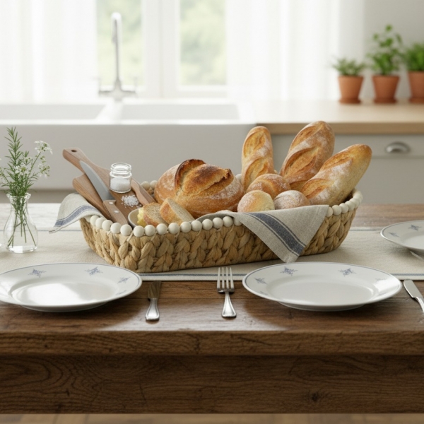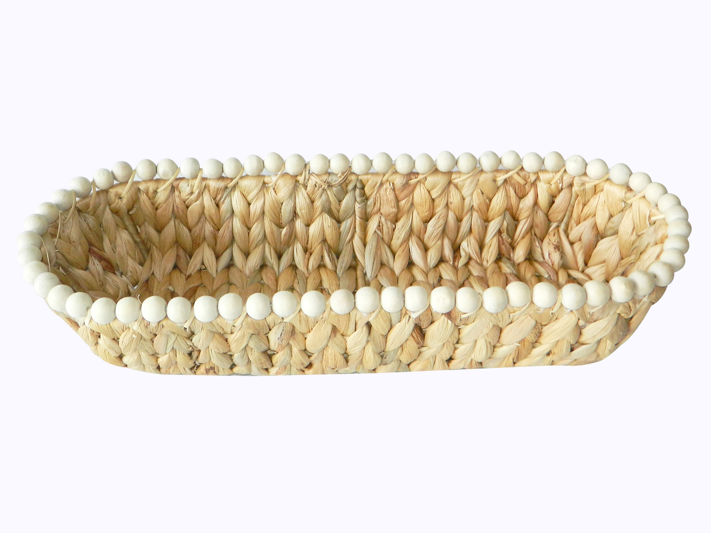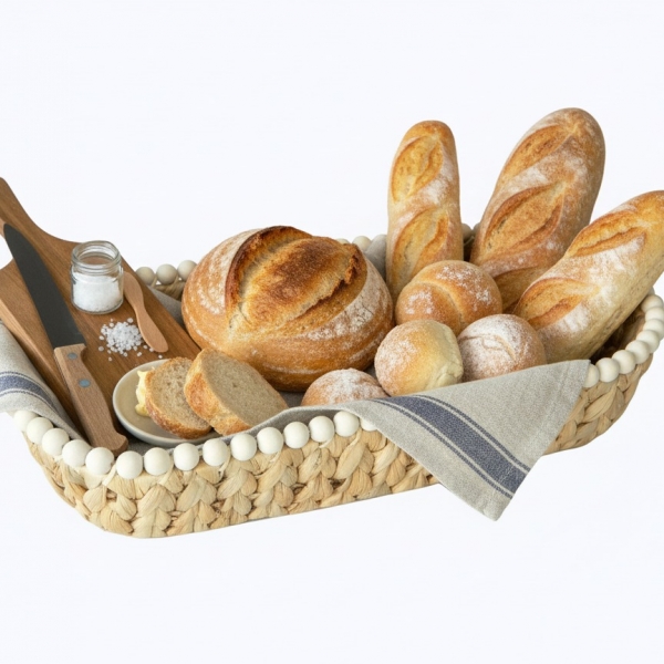 The oval water hyacinth bread basket with wooden bead is a charming and eco-friendly addition to any kitchen or dining space. Handcrafted with care, it showcases the natural beauty of water hyacinth, woven into an elegant oval shape. The intricate weaving pattern provides durability and ensures that the basket can safely hold and display your favorite breads and pastries. The addition of a wooden bead as a decorative element adds a touch of rustic charm to the design. Not only does this bread basket serve a practical purpose, but it also brings a warm and inviting aesthetic to your table setting, making it a delightful choice for any home.