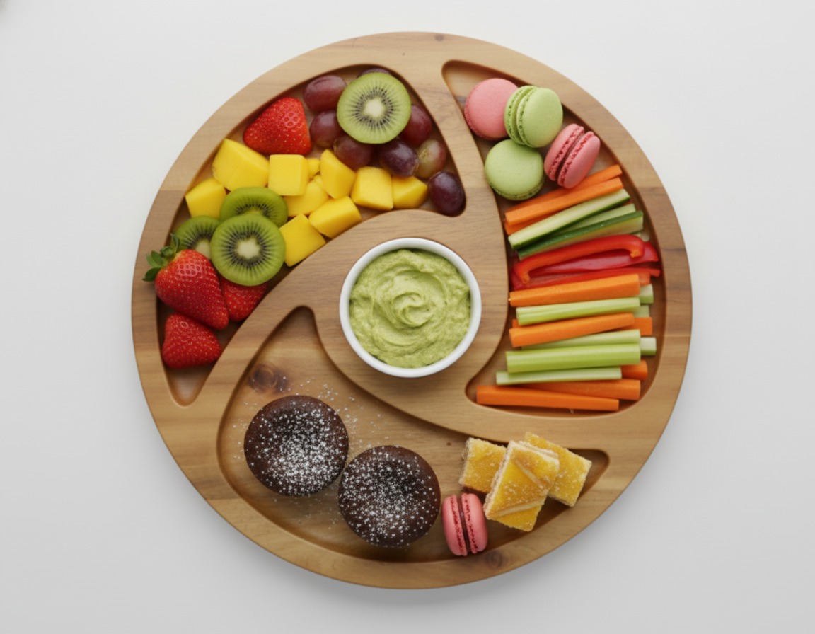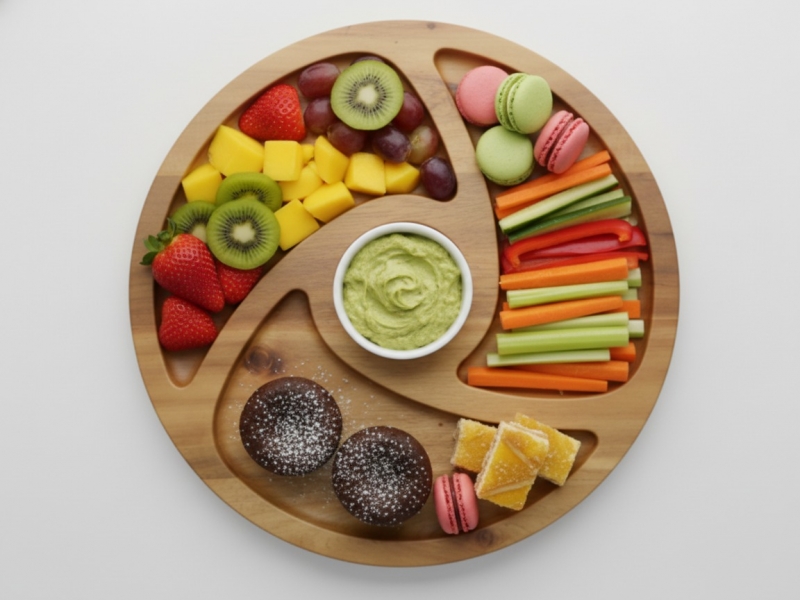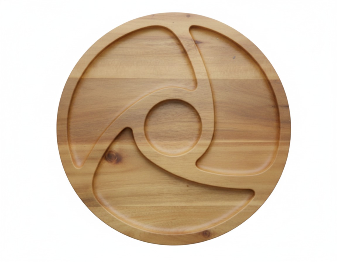 Immerse yourself in the sleek design of this round acacia wood serving platter, perfect for elevating any dining or entertaining experience. This elegantly designed sectional tray features a unique three-compartment layout around a central circular dip holder, making it ideal for presenting a variety of appetizers, cheeses, charcuterie, or snacks. Crafted from durable and sustainably sourced acacia wood, its natural grain patterns add a touch of warmth and sophistication to any table setting. Whether hosting a casual gathering or a formal dinner, this versatile wooden platter provides a stylish and functional solution for food presentation. Its smooth finish and ergonomic design ensure easy handling and cleaning, making it a must-have accessory for modern kitchens and homes across both USA and European markets. Enhance your culinary displays with this timeless piece.