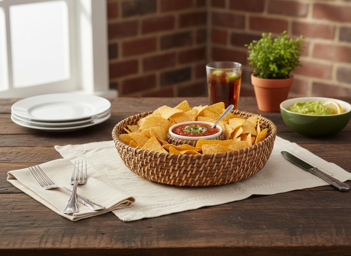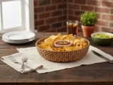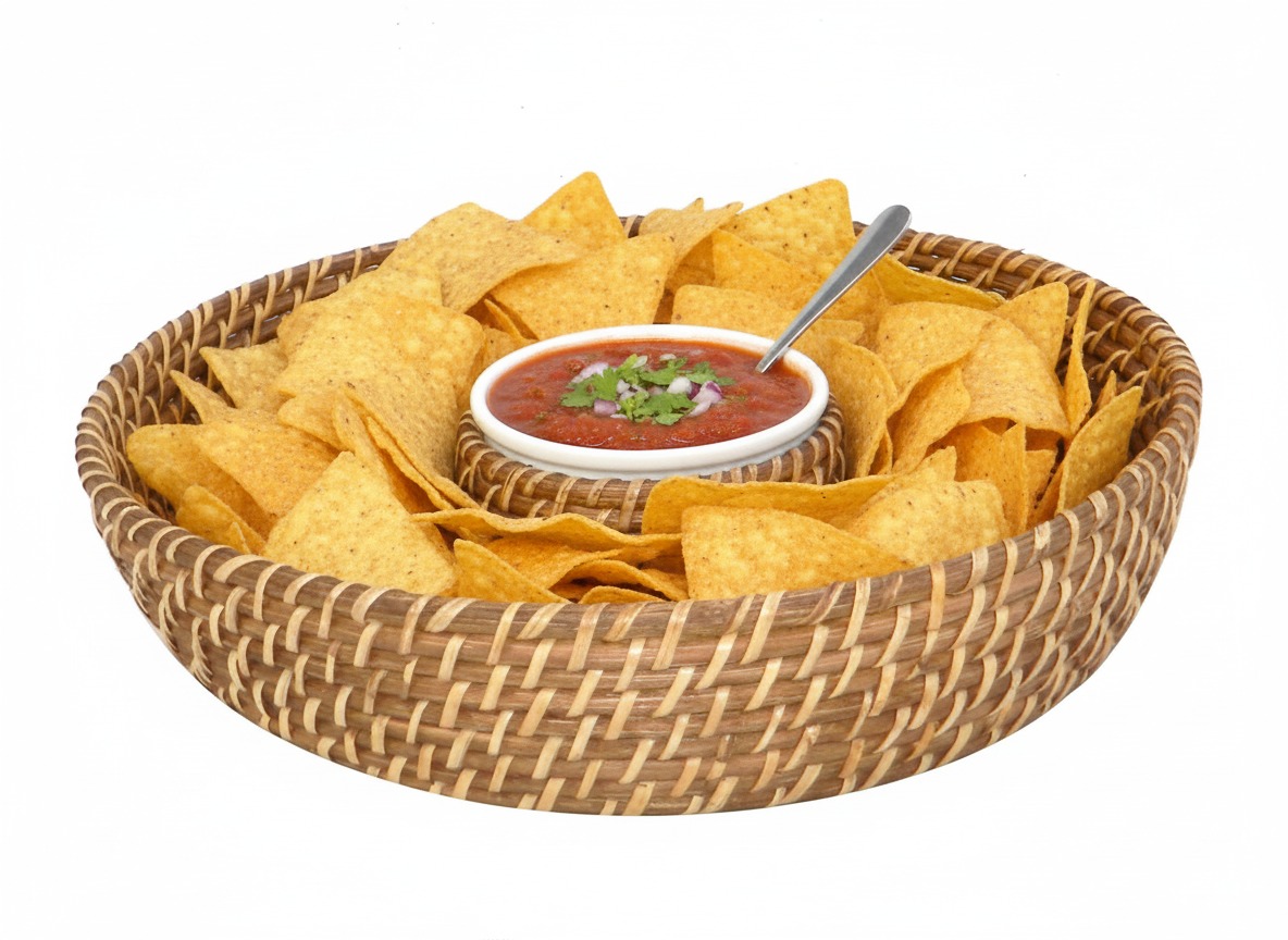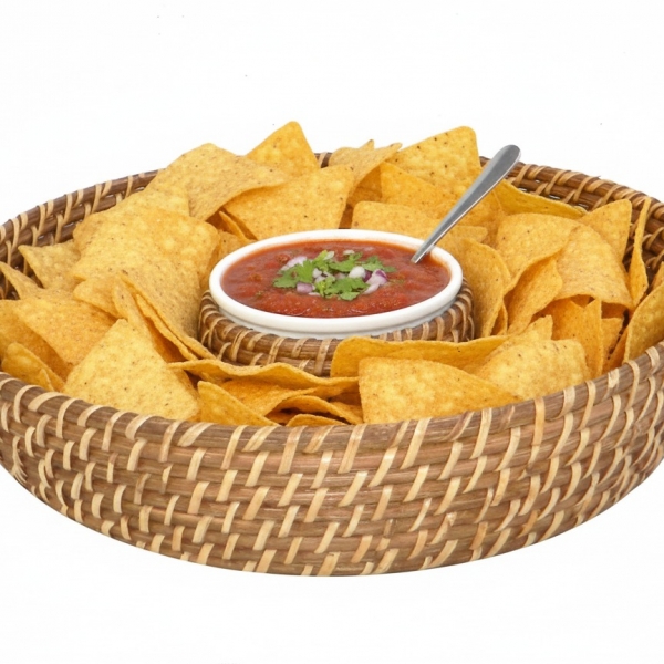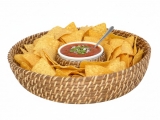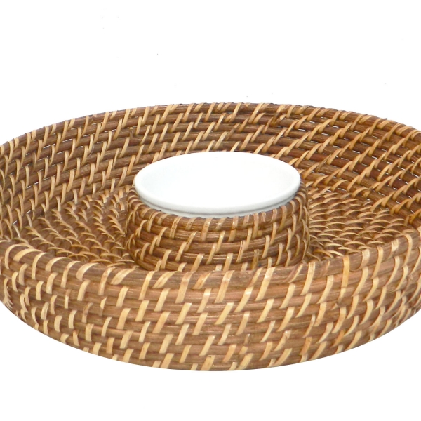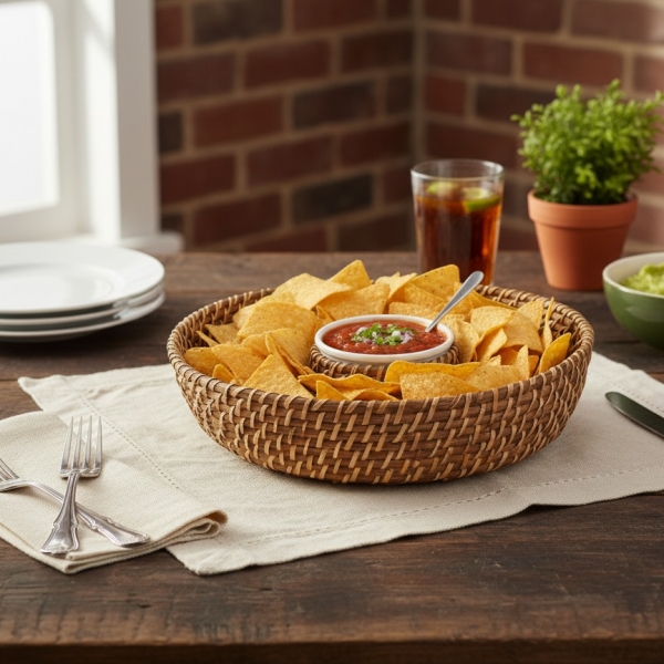 This elegant rattan dip and chip serving tray offers a stylish and practical solution for effortless entertaining. Hand-woven from natural rattan, its beautiful round design features a cleverly integrated central compartment perfectly sized to hold a white ceramic dip bowl, allowing you to serve your favorite sauces, guacamole, or salsa alongside crispy chips, fresh vegetables, or artisan bread. Ideal for casual gatherings, outdoor picnics, or sophisticated dinner parties, this versatile tray adds a touch of bohemian charm and organic warmth to any table setting. The durable, eco-friendly construction ensures long-lasting use, making it a sustainable and attractive choice for your kitchen and dining needs. Elevate your hosting with this beautifully crafted, functional piece designed for convenience and style.