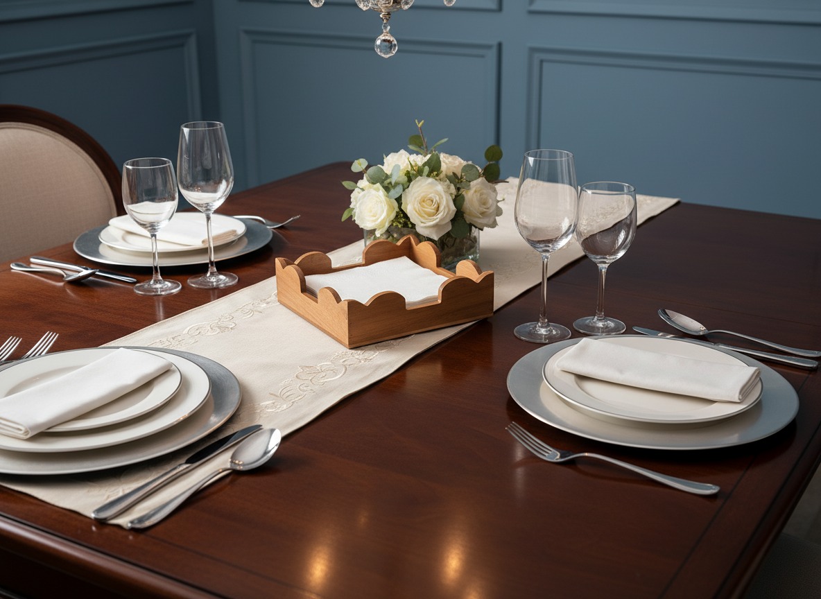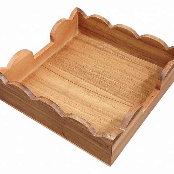 Enhance your dining experience with this elegant acacia wood napkin holder, featuring a unique scalloped edge design. Crafted from beautiful natural acacia wood, this square-shaped holder showcases rich grain patterns, adding a touch of rustic charm and sophistication to any table setting. Ideal for keeping napkins tidy and easily accessible during meals, gatherings, or everyday use. Its sturdy construction ensures durability, while the warm, inviting tone complements various decor styles from farmhouse to modern minimalist. Perfect for kitchens, dining rooms, outdoor entertaining, or even as a decorative accent in a living space. This versatile and stylish accessory is a must-have for organizing your home essentials with natural elegance. It's designed to hold standard-sized napkins, making it a practical and aesthetically pleasing addition to your home decor. Discover the timeless beauty and functionality of natural wood craftsmanship.