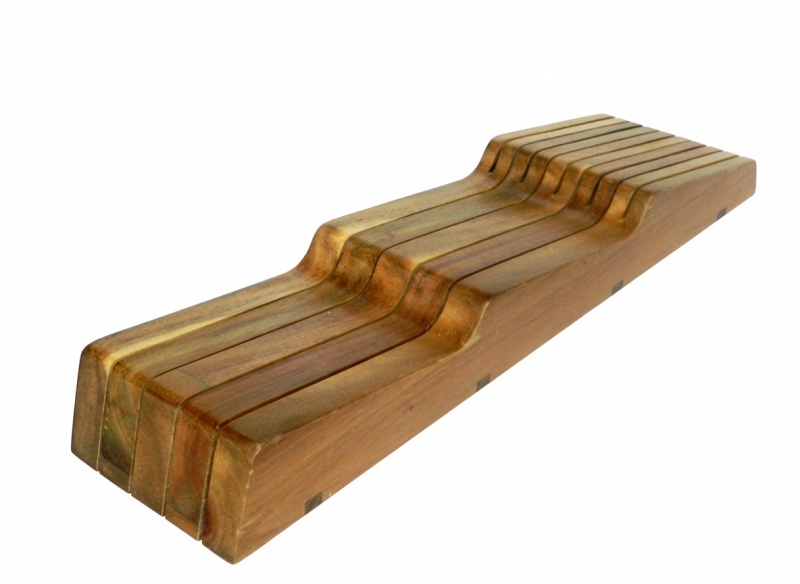 This image features a sleek, natural wood knife organizer designed for optimal kitchen drawer storage. Crafted from beautiful, durable wood, the organizer boasts multiple tiered slots, providing a secure and space-saving solution for a variety of kitchen knives. Its ergonomic design ensures knives are stored safely, preventing damage to blades and keeping them easily accessible. Ideal for decluttering countertops and maximizing drawer space, this stylish accessory adds a touch of natural elegance to any kitchen decor. The rich wooden grain offers a warm, inviting aesthetic, blending seamlessly with both modern and traditional kitchen styles. Perfect for home cooks and culinary enthusiasts alike seeking a tidy and efficient knife storage solution.