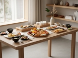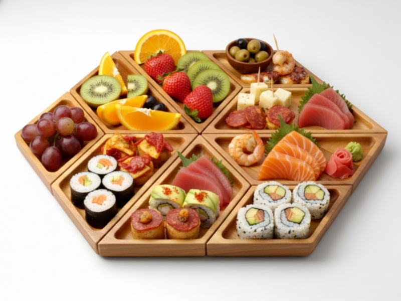 This unique wooden serving platter, crafted from rich, light-toned wood, presents a modern and modular design. Arranged in a captivating hexagonal pattern, it features multiple interlocking compartments of varying triangular and trapezoidal shapes, perfect for organizing an assortment of snacks, appetizers, or condiments. Each section is smoothly finished, highlighting the natural wood grain and offering a sophisticated aesthetic that complements any contemporary decor. Ideal for entertaining guests or simply adding a touch of elegant organization to your table, this versatile piece blends functionality with minimalist style. Its distinctive design makes it a focal point, whether used for a cheese board, a selection of tapas, or a candy dish. This beautiful and practical item is a must-have for stylish home entertaining.