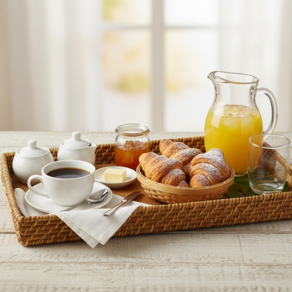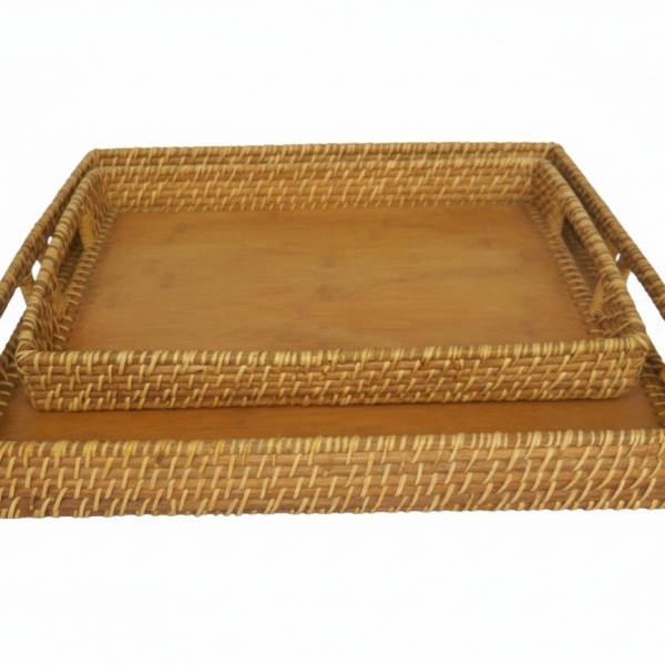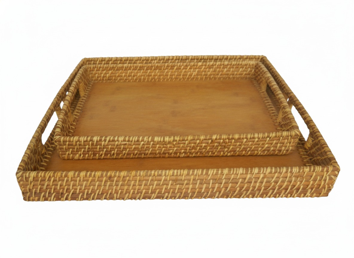 Introducing this elegantly crafted rattan serving tray, featuring a sturdy bamboo bottom, perfect for adding a touch of natural sophistication to any space. Its rectangular design, complemented by integrated cutout handles, makes it ideal for effortlessly serving beverages, snacks, or decorative items. The rich, natural wood tones of the bamboo base contrast beautifully with the intricately woven rattan sides, creating a versatile piece that blends seamlessly with various interior styles, from bohemian to modern farmhouse. Whether used for entertaining guests or organizing essentials, this eco-friendly tray provides both functionality and aesthetic appeal, enhancing your home decor with its organic charm and durable construction.