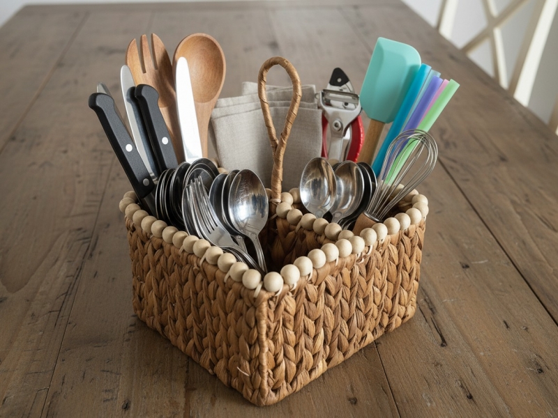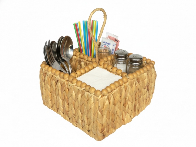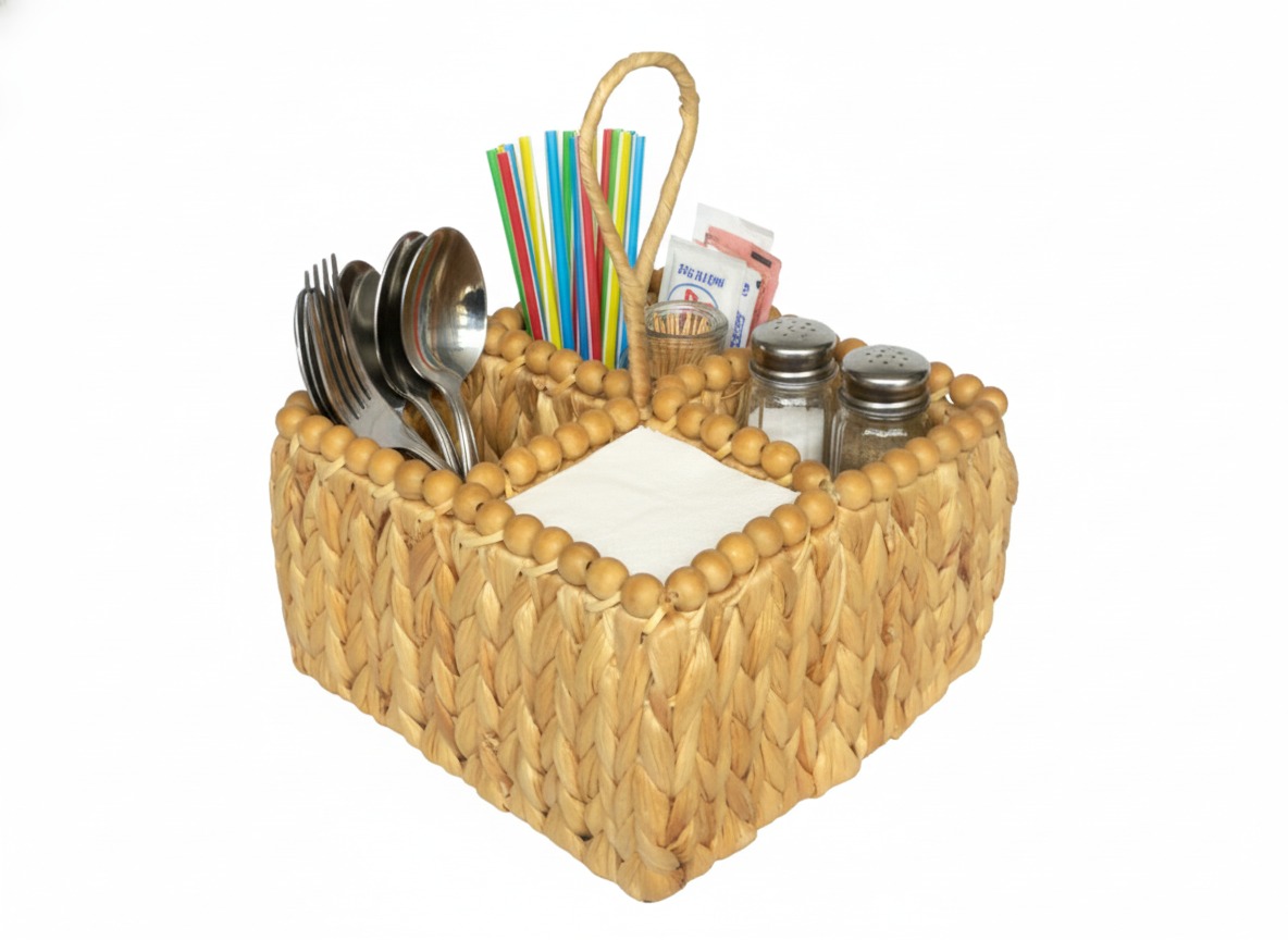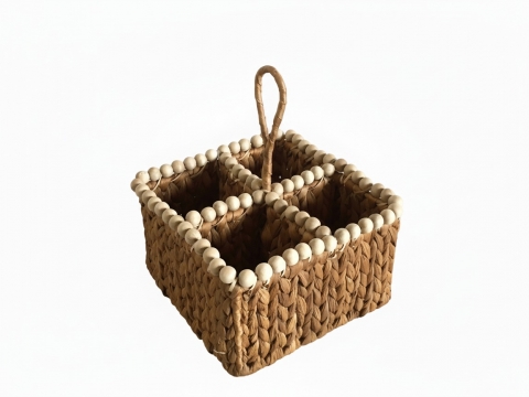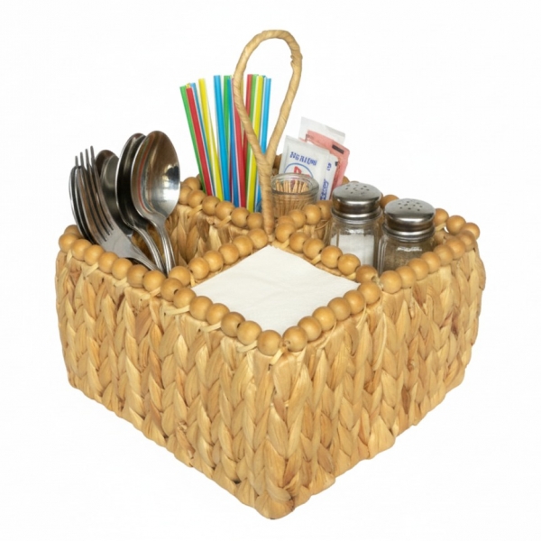 The Square Water Hyacinth Flatware Caddy with Wooden Beads is a stunning addition to any dining table or kitchen counter. Made from natural water hyacinth, this caddy brings an organic touch to your space. The white washed finish adds a touch of elegance and complements a variety of decor styles. The square shape provides ample space for holding flatware, napkins, or other kitchen essentials. The wooden bead accents on the sides add a charming detail to the caddy. Not only is this caddy functional, but it also adds a rustic and coastal vibe to your dining experience.