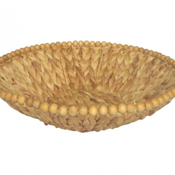 Elevate your home decor with this beautifully crafted round water hyacinth bowl, featuring a distinctive woven texture and a charming wooden beaded rim. This versatile shallow bowl, made from sustainable natural fibers, brings a touch of rustic elegance and bohemian flair to any space. Perfect for adding organic warmth, it serves as an exquisite decorative accent or a functional storage solution. Its neutral tones seamlessly blend with various interior styles, from farmhouse chic to coastal retreat. Ideal for tabletops, shelves, or counters, this durable and stylish piece offers both aesthetic appeal and practical utility, making it a must-have for curated living.