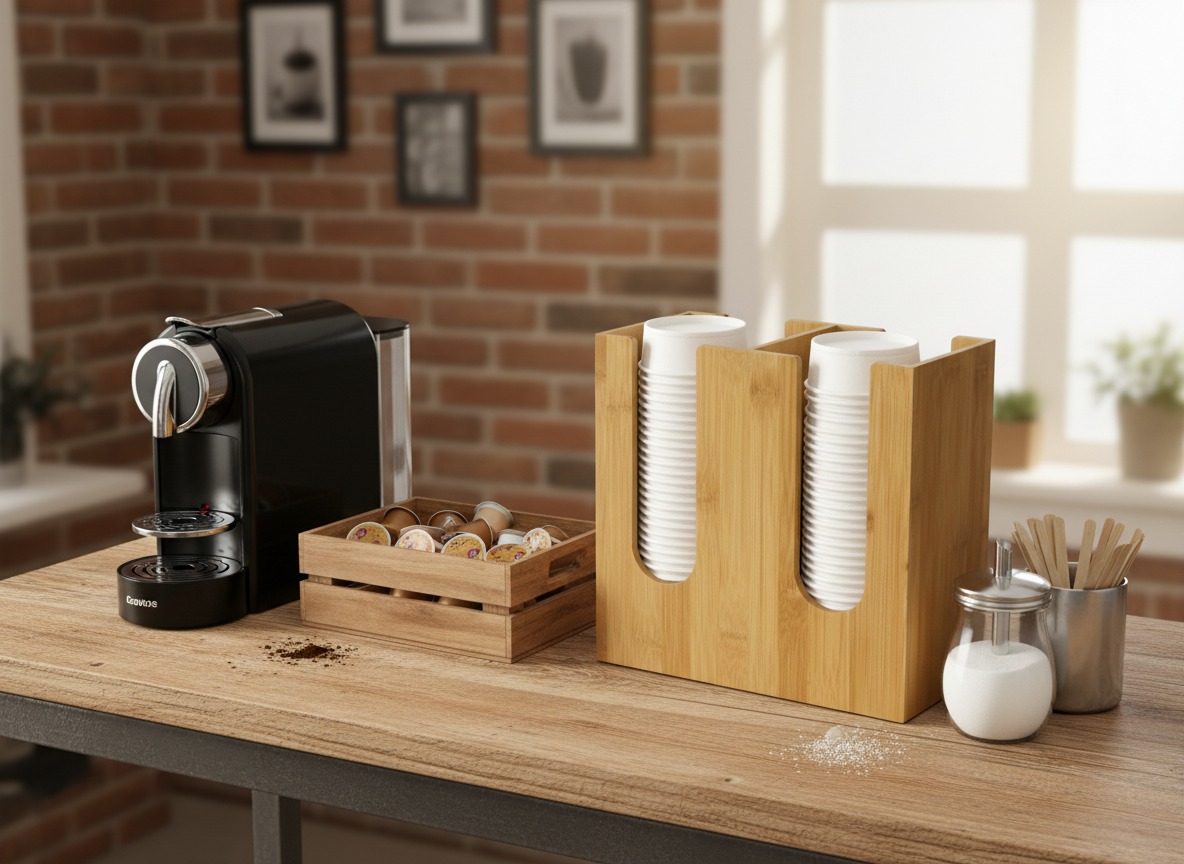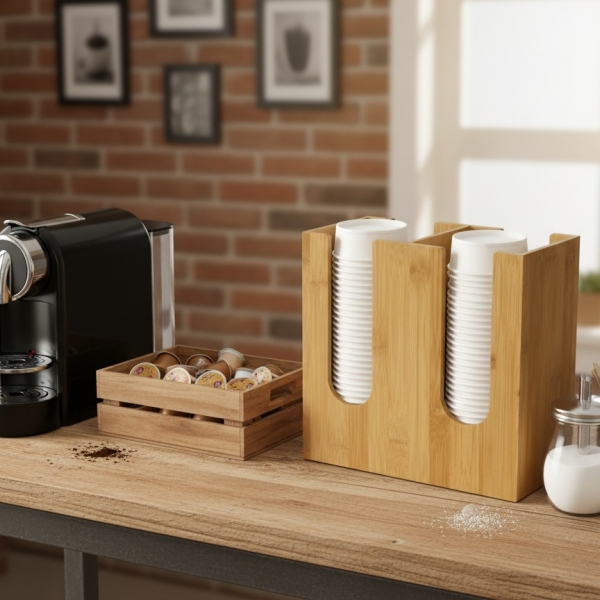 Discover this elegant and functional bamboo cup holder, perfect for organizing your kitchen countertop, coffee station, or office desk. Crafted from sustainable, natural bamboo, this stylish organizer features three distinct compartments, each with a clever cut-out design to securely cradle various beverage cups, including mugs with handles, paper cups, or reusable tumblers. Its vertical design maximizes space, keeping your surfaces clutter-free while adding a touch of natural warmth to any decor. Ideal for homes, cafes, or break rooms, this versatile holder ensures easy access to your favorite cups. The durable construction and smooth finish highlight its quality and eco-friendly appeal, making it a practical and aesthetic addition to your daily routine. Elevate your organization with this essential bamboo storage solution.
