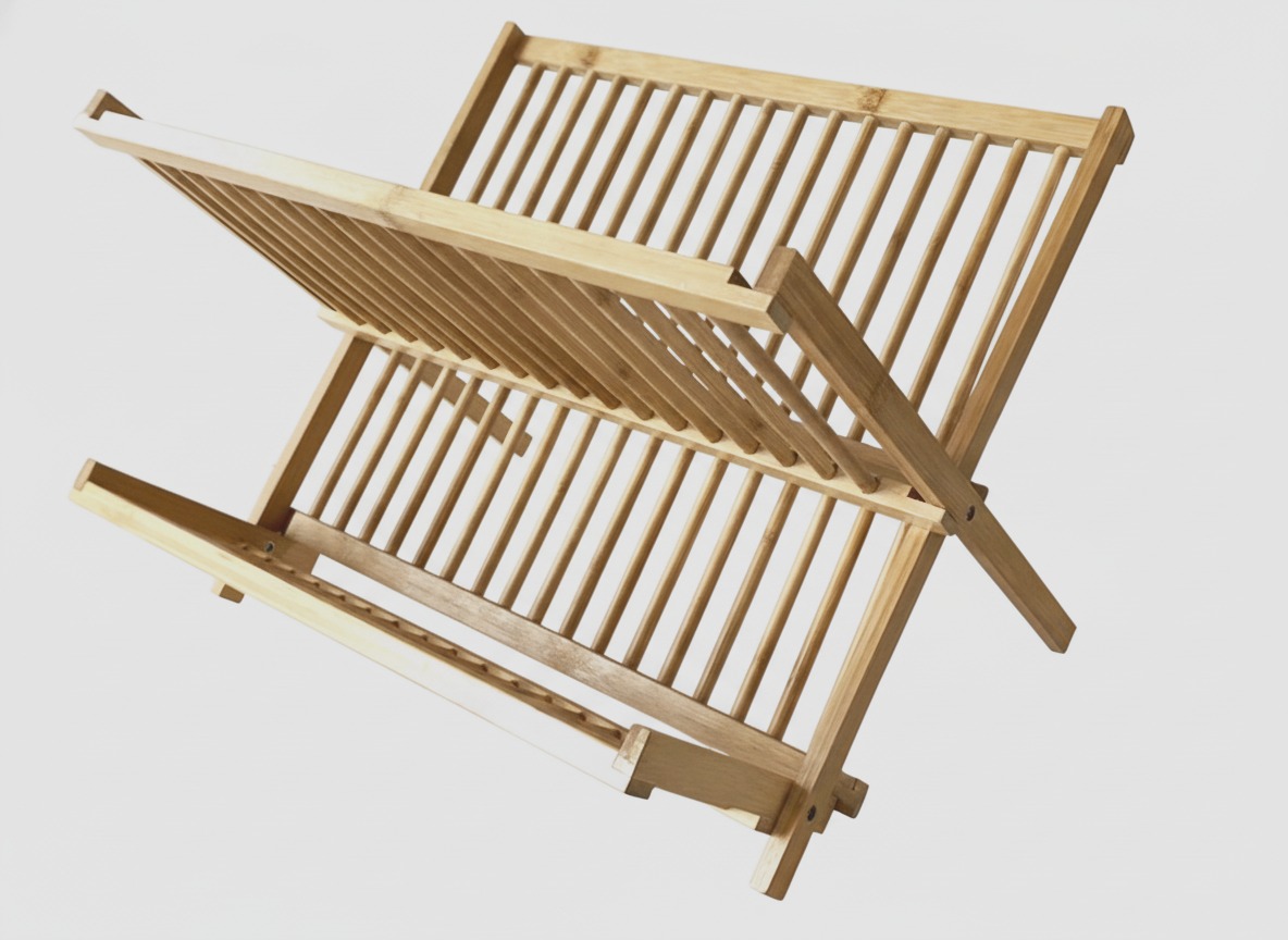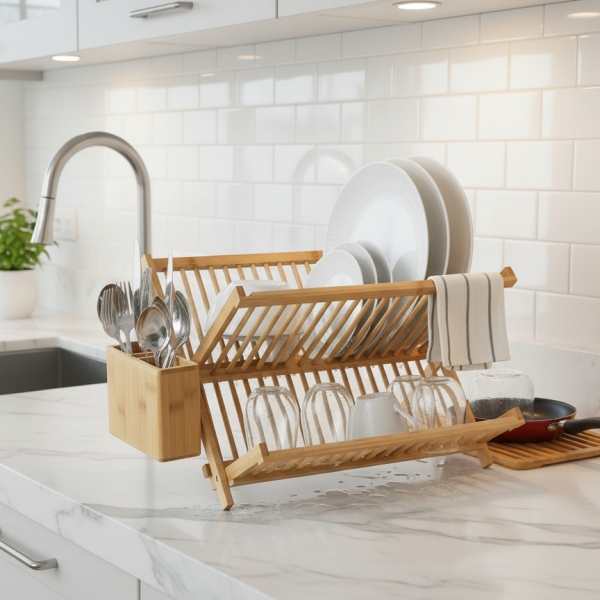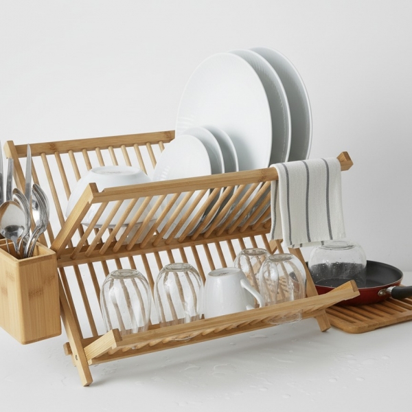 Elevate your kitchen organization with this stylish and functional bamboo dish rack. Crafted from sustainable, eco-friendly bamboo, this two-tier drying rack offers ample space for plates, bowls, and cutlery, allowing them to air dry efficiently. Its natural light wood finish complements any kitchen decor, from modern minimalist to rustic farmhouse. The foldable design ensures easy storage when not in use, making it ideal for smaller kitchens or those seeking a clutter-free countertop. Perfect for everyday dish drying or as an elegant display stand for culinary essentials, this durable and water-resistant rack combines practicality with a touch of natural elegance. A must-have for an organized and sustainable home.