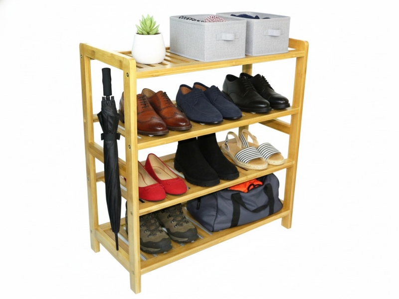 The 4-tier bamboo shoe rack is a versatile and eco-friendly storage solution for organizing your footwear. Crafted from sustainable bamboo, this stylish rack offers durability and a natural aesthetic appeal. With four spacious shelves, it can accommodate a significant number of shoes, keeping them neatly arranged and easily accessible. The open design allows for proper air circulation, preventing odors and promoting shoe freshness. Its compact size makes it ideal for small spaces like entryways or closets. Assembly is a breeze, and the sturdy construction ensures stability. The bamboo shoe rack is not only functional but also adds a touch of elegance to any room.