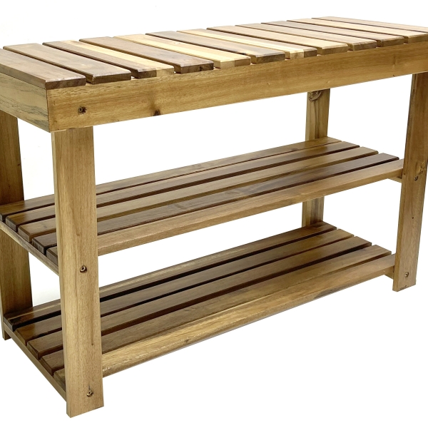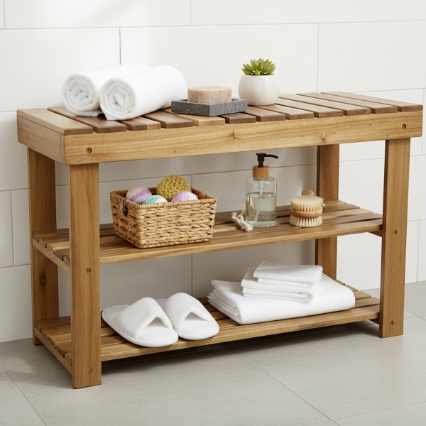 Discover the versatility and natural beauty of this three-tiered acacia wood bath bench, perfect for enhancing any bathroom or spa environment. Crafted from durable, water-resistant acacia wood, its slatted design promotes optimal airflow and quick drying, making it an ideal shower seat or practical storage solution. The rich, warm tones of the natural wood grain add a touch of organic elegance to your space. With its sturdy construction and multiple shelves, this multifunctional bench provides convenient storage for towels, toiletries, and decorative items, or offers a comfortable seating option. Its compact yet spacious design makes it suitable for both small and large bathrooms, mudrooms, or even entryways, blending seamlessly with various decor styles from modern minimalist to rustic charm. This acacia bath bench is a stylish and functional addition designed for lasting use.