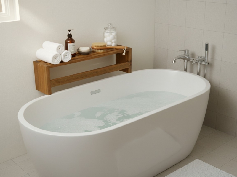 Discover the elegance and functionality of this minimalist Acacia wood bath shelf, perfect for enhancing your bathroom's decor and organization. Crafted from durable, water-resistant Acacia wood, this versatile shelf offers a stylish solution for storing essentials. Its slatted design ensures proper drainage and ventilation, making it ideal for wet environments. Whether used as a shower caddy to hold soaps and shampoos, a towel rack, or a decorative bench, its natural wood finish brings a spa-like tranquility to any space. This robust and eco-friendly piece is designed for both aesthetic appeal and practical everyday use, seamlessly blending with modern or traditional bathroom interiors. Elevate your bathroom experience with this durable and beautiful wooden accessory, a must-have for a tidy and sophisticated sanctuary.