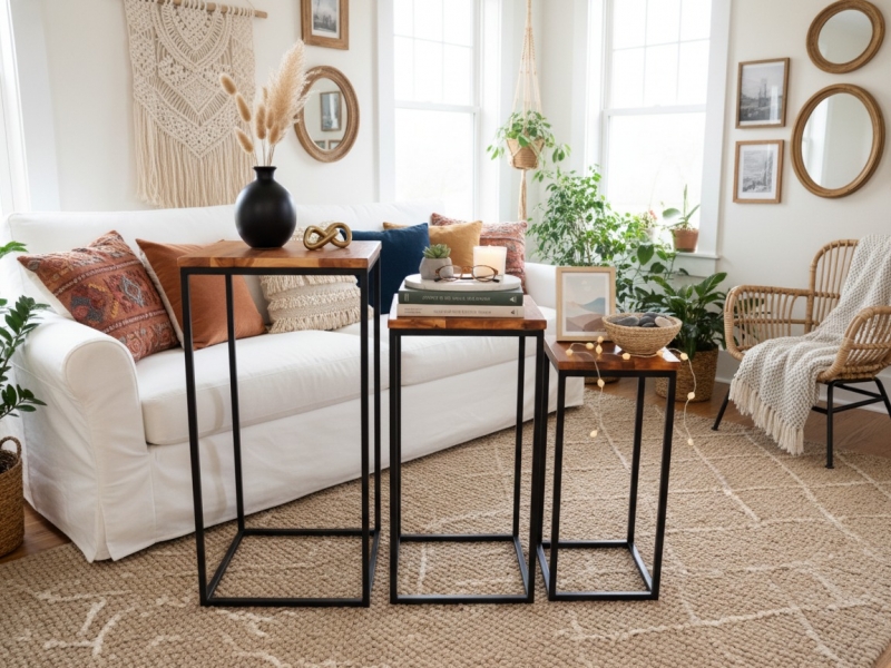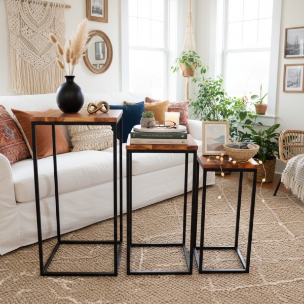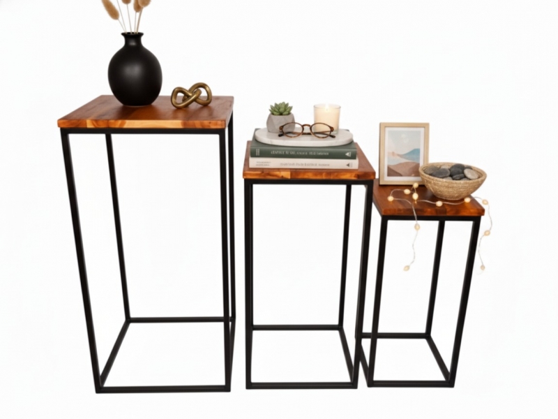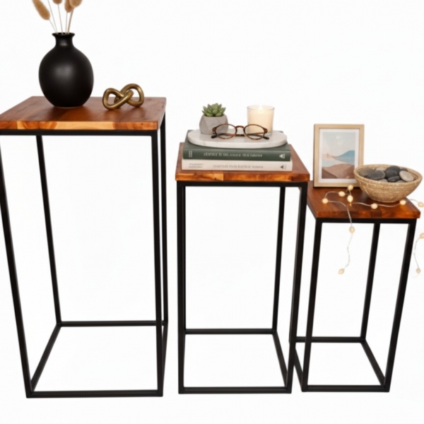 Enhance modern interiors with our versatile Acacia Wood & Metal Frame Nesting End Tables, meticulously handcrafted by skilled artisans at Ngoc Dong in Vietnam.