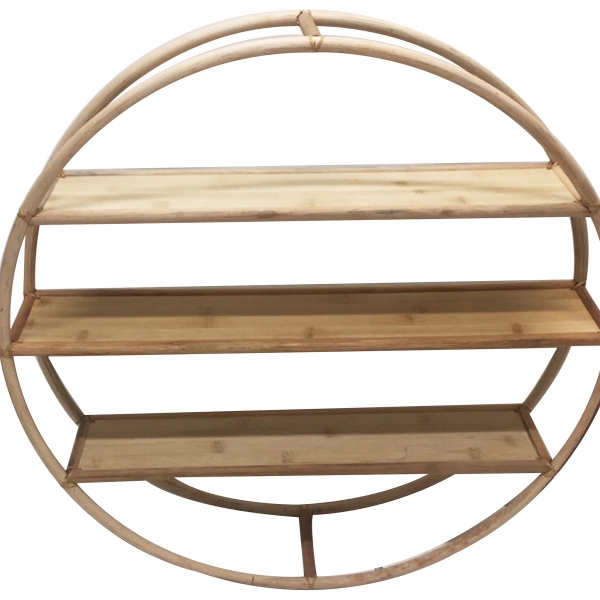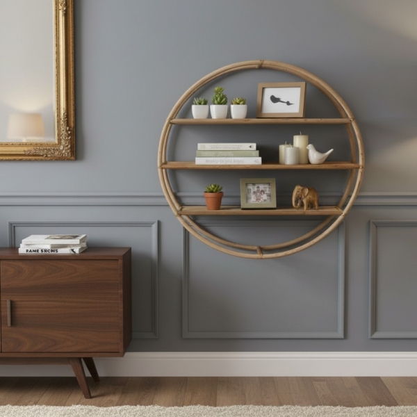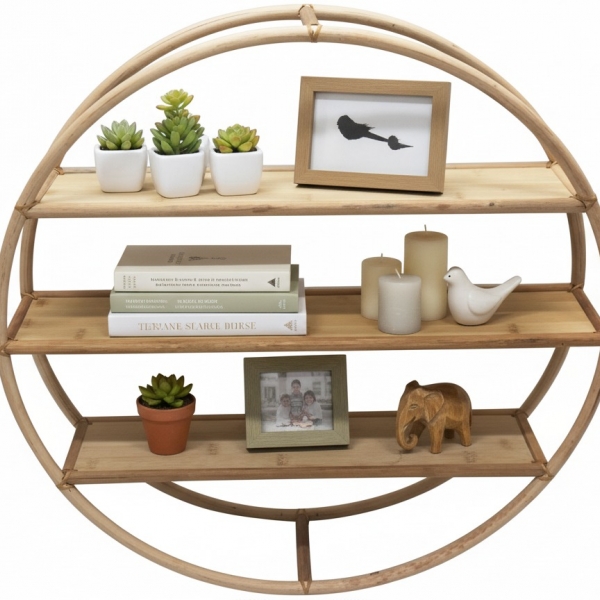 Discover this elegantly crafted circular rattan wall shelf, a perfect blend of natural aesthetics and practical storage. Featuring three sturdy, flat shelves within its charming round frame, this piece offers ample space to display your favorite decor, small plants, or books. The light, natural wood tones and bohemian design make it an ideal accent for any room, from living areas to bedrooms or even bathrooms. Its unique round shape adds a touch of organic modern style, enhancing both contemporary and rustic interiors. Easily mountable, this decorative and functional shelving unit is perfect for organizing and showcasing your personal touches while adding warmth and texture to your walls. A stylish solution for minimalist and boho-chic homes.